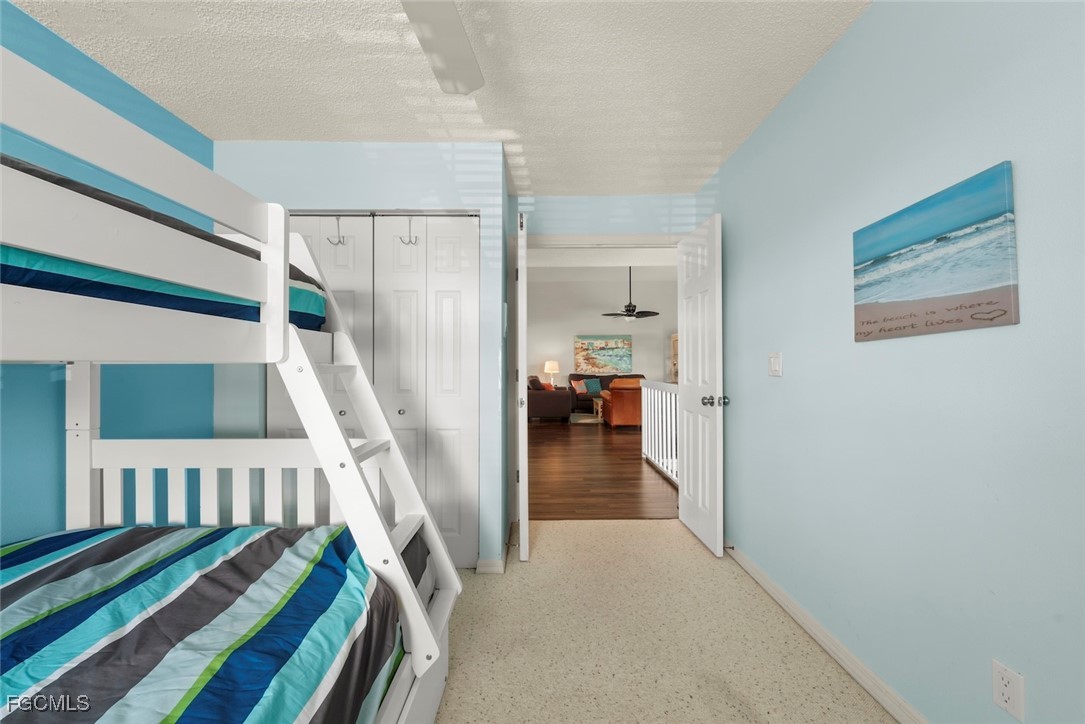 SUNLIGHT POURS IN OFF THE GLISTENING LAKE. Second floor end unit with windows seemingly everywhere. Located in the Rivers Edge Community of prestigious Gulf Harbour Golf and Country Club in Southwest Ft. Myers. The living room, kitchen and primary bedroom are wrapped around the huge screened lanai with the sliding doors forming a corner of glass that allows the spectacular water view to sparkle through virtually the entire unit. Vaulted ceilings increase the open feeling. Laminate flooring thru the living area with Berber carpet in the bedrooms. Updated kitchen with granite countertops and lazy Susan lower units. Primary bedroom accommodates a king bed plus supporting furnishings. Large walk-in closets. Updated bath. Large closets in both guest bedrooms, one with a conventional bedroom set and the other with bunk beds and pull-out trundle. Stacked washer and dryer with utility closet adjacent to bedrooms. Updated guest bath. Dining area overlooks water view. Covered reserved parking. Guest parking nearby. Just a few steps to the community pool and spa. Sold completely turnkey with classic comfortable furnishings so it is move-in ready, either as a winter hideaway or great seasonal rental. Miles of pathways inside the gate to enjoy bike rides, jogging, or casual walks in the sunshine. Close to Ft. Myers Beach, Sanibel Beach and nearby Bunche Beach. Or simply stroll the private Gulf Harbour Eagle Perch Island for gorgeous sunsets. Surrounded by shopping and restaurants. Easy access to SWFL International Airport, plus Twins and Red Sox baseball stadiums. Additional amenities of golf, tennis, fitness center and two restaurants require an optional membership, now available at a surprisingly low fee.