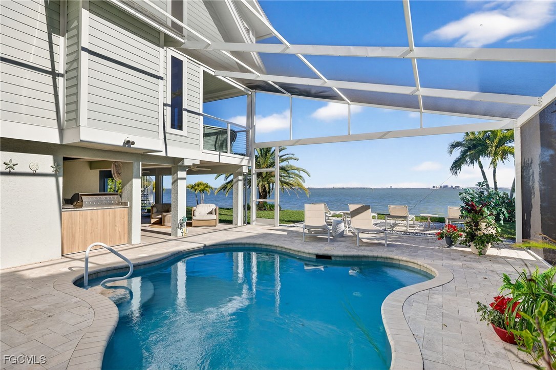 Outdoor living is equally impressive, highlighted by a covered outdoor kitchen overlooking the pool and bay. A heated pool allows for year-round enjoyment, making this an ideal setting for entertaining and waterfront living.