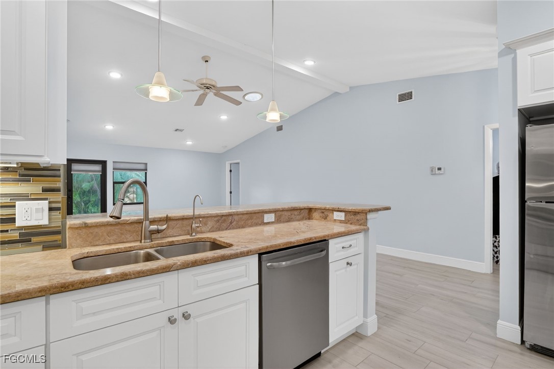 This completely updated 2-bed/2-bath END UNIT attached villa is in the gated Governors Island community offers low-maintenance living. The home underwent a full renovation in 2017, featuring new kitchen cabinetry, appliances, and plumbing fixtures; updated vanities, tile, lighting and fixtures in both bathrooms; and neutral tile flooring throughout. Current owners also enclosed the lanai adding approximately 70 sq. ft. to the great room and increasing the interior living space to a total of 1,150 sq. ft. Additional upgrades include a new HVAC system, hurricane-rated windows and doors, a whole-house water softener, and a reverse osmosis system in the kitchen. A new water heater was installed in 2020. Well maintained and owner-occupied until December 2025, this villa is truly move-in ready. Guest parking and the community pool are both just a 3 minute stroll away. Governors Island is a peaceful, gated community very close to the Bell Tower shops, abundant dining and retail options, and less than 30 minutes from the beaches. With reasonable HOA dues and no work needed, this home offers exceptional value with many years of low-cost maintenance ahead of you. This villa is in a low-risk flood zone (X-Flood Zone). The unit did not flood during the last 3 hurricane events. Flood insurance is not required by Lenders for residences located in X-Flood zones.