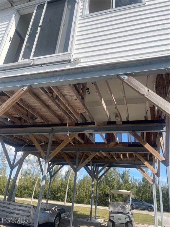 The existing elevated 2-bedroom, 1-bath structure (832 sq. ft. under air) was impacted by Hurricane Ian and has since been raised above flood elevation. The home is currently uninhabitable and in unfinished condition, with framed walls and floor stringers in place, offering the option to renovate or remove and build new.