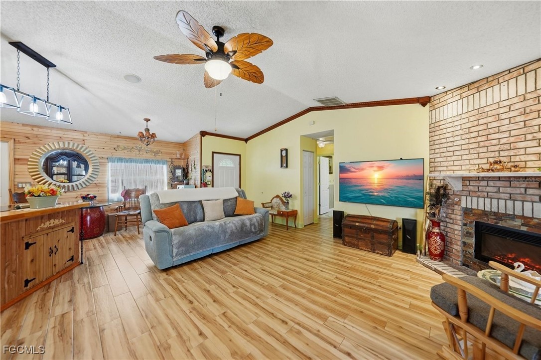 Welcome to 2213 NE 6th Place, a truly unique Cape Coral residence that brings the warmth and character of a rustic cabin retreat to sunny Southwest Florida. This beautifully reimagined 3-bedroom, 2-bathroom home with a 2-car garage offers a cozy, inviting atmosphere rarely found in the area, blending modern upgrades with timeless, lodge-style charm. From the moment you step inside, you’ll be greeted by rich textures, warm tones, and thoughtfully curated finishes that evoke the feeling of a peaceful mountain getaway. The living space is anchored by a striking electric fireplace, creating the perfect focal point for relaxing evenings and adding to the home’s distinctive cabin ambiance. Natural-inspired design elements and a comfortable layout make this home feel welcoming, intimate, and functional. The kitchen and living areas flow seamlessly, ideal for everyday living or entertaining, while the bedrooms provide quiet, comfortable retreats. Both bathrooms are tastefully updated to complement the home’s rustic yet refreshed style. Beyond its character, this home delivers major peace-of-mind upgrades, including a roof just 3 years old, brand-new A/C, and a new water heater, ensuring efficiency and reliability for years to come. A detached shed adds valuable extra storage for tools, hobbies, or outdoor equipment. Situated on a quiet street in NE Cape Coral, this home offers easy access to shopping, dining, schools, and major roadways, while still feeling like your own private escape. If you’re looking for something truly different—where cozy cabin vibes meet modern convenience—2213 NE 6th Place is a must-see. This one-of-a-kind home is perfect as a primary residence, seasonal getaway, or investment with standout character that leaves a lasting impression.