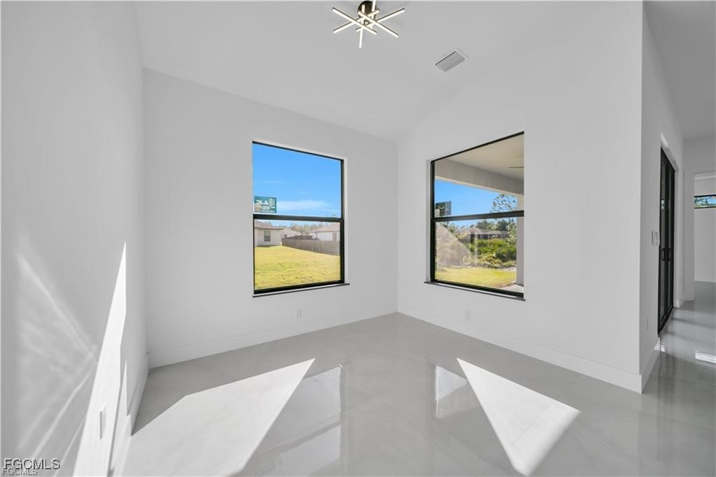 Modern home featuring high ceilings, underground electricity, and pre-installed electrical and plumbing connections in the garage ready for future use. Includes washer and dryer, with exclusive black quartz countertops on the kitchen island and all bathrooms for a touch of elegance. Impact-resistant doors and windows throughout, including the master bedroom and garage, offering safety and peace of mind. The property features a spacious den, a modern rain gutter system surrounding the roof, and a wide entry with a short hallway that opens into a bright kitchen and living area. Enjoy sleek, contemporary shower systems and a large office room separate from the other three bedrooms—perfect for remote work or creative projects. Equipped with a full sprinkler system and located in a rapidly growing residential neighborhood surrounded by new constructions, this home offers style, functionality, and comfort in one of the most desirable and expanding areas of the city