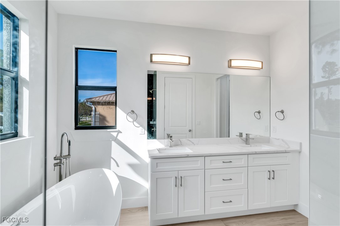 The kitchen is designed for both function and style, showcasing quartz countertops, stainless steel appliances, a large center island, and a walk-in pantry—perfect for everyday living and entertaining. The primary suite includes a spacious walk-in closet and a well-appointed bathroom with a separate tub and shower. Additional highlights include built-in cabinetry, custom mirrors, and an interior laundry room with utility sink.