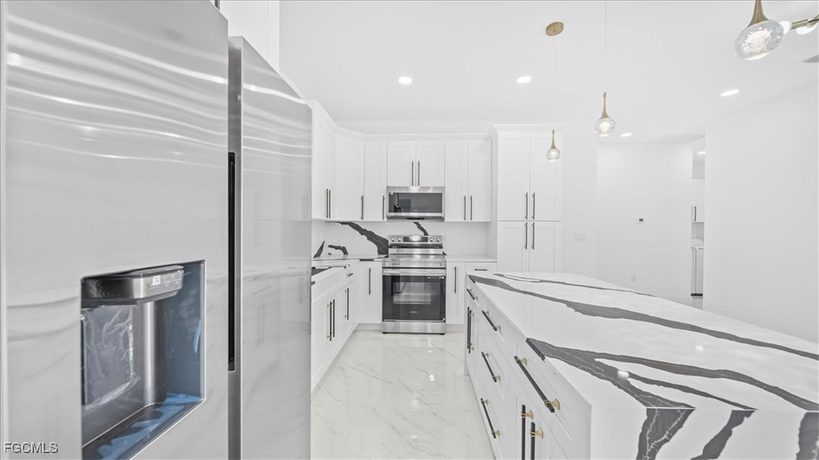 The chef-inspired kitchen is a true showstopper, designed for both everyday living and entertaining. It features an abundance of cabinetry with soft-close doors and drawers, elegant quartz countertops, and a large center island that provides extra prep space and seating. Completing the space are top-of-the-line stainless steel appliances that will impress even the most discerning cook.
