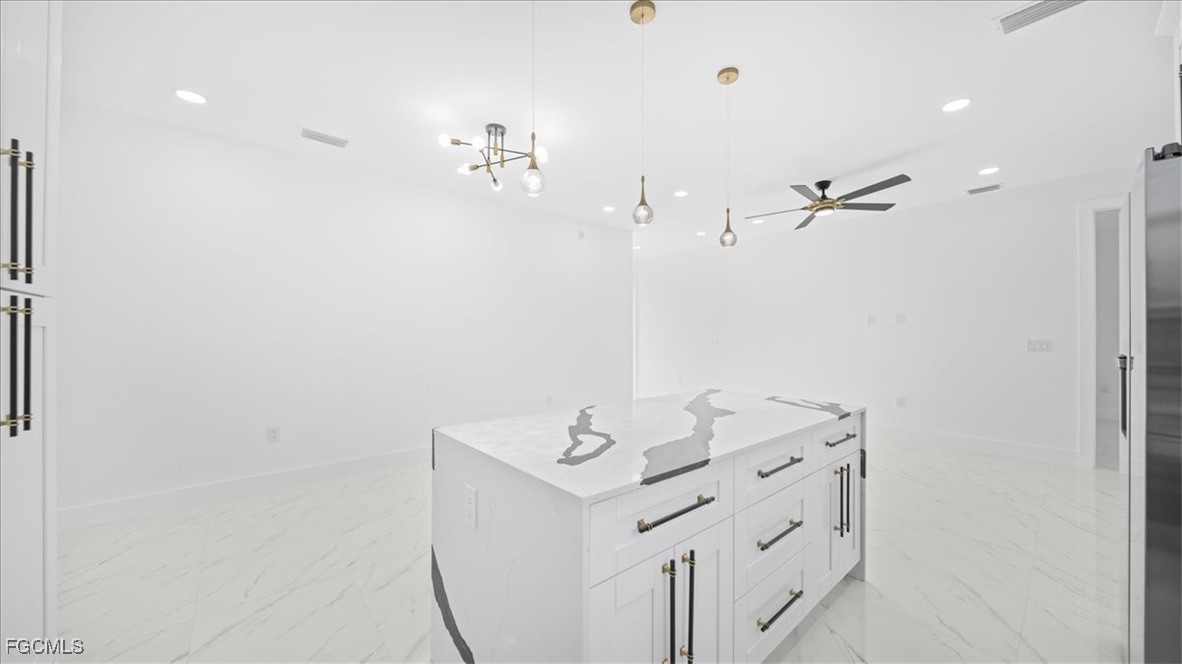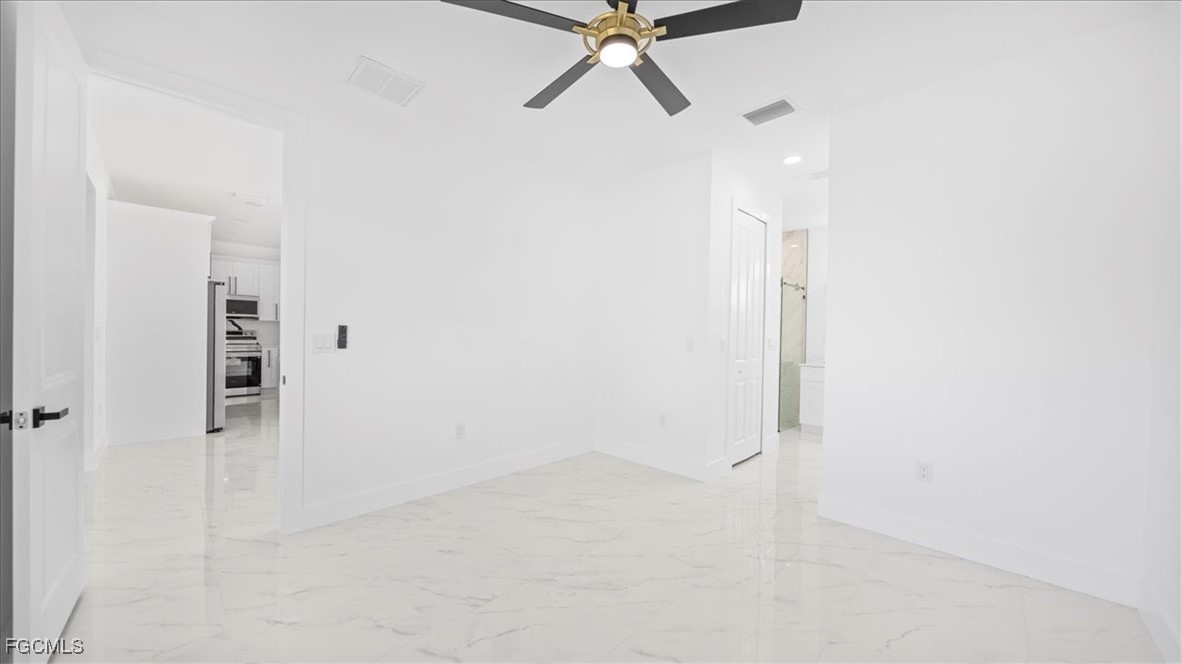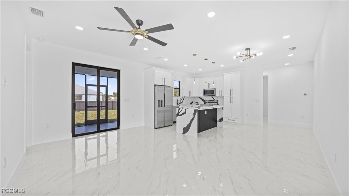 Step inside and be greeted by soaring high ceilings and abundant natural light that enhance the home’s open and airy feel. Large porcelain tile flows throughout, creating a sleek, cohesive look that’s both stylish and easy to maintain. The spacious living room is highlighted by a commercial-size ceiling fan, adding both character and comfort.