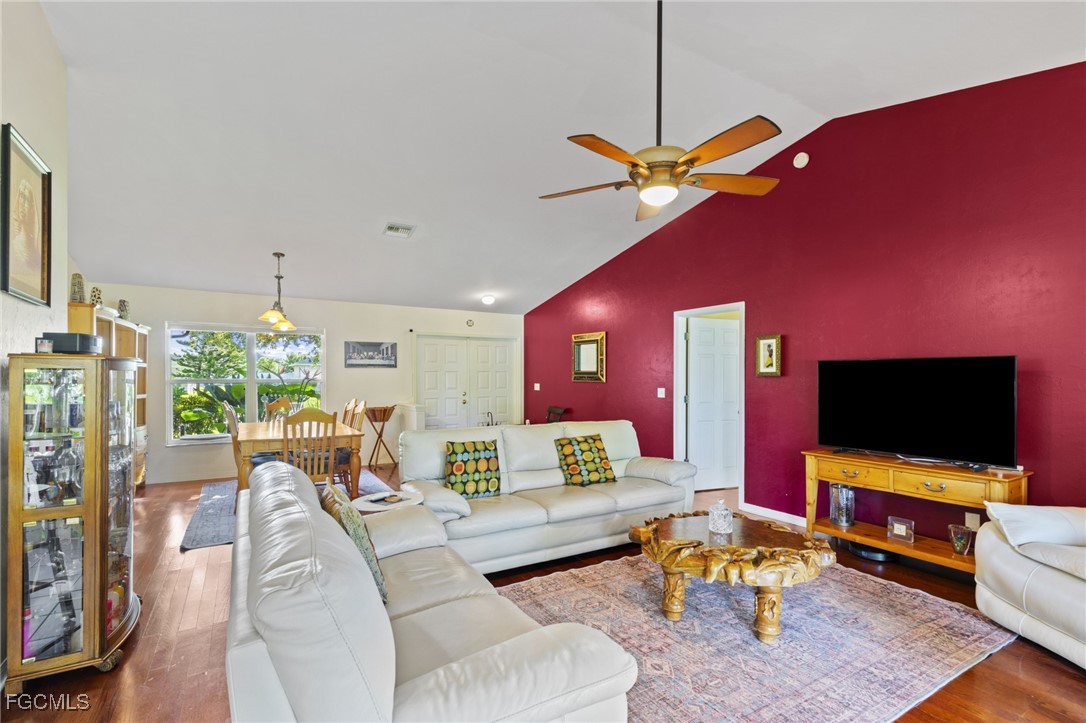 This 3-bedroom, 2-bathroom home with no HOA offers bright, open living with soaring vaulted ceilings and wood floors throughout the main living areas and primary bedroom. The living/dining area provides plenty of space for both casual meals and a more formal dining setup. The kitchen features ample storage, a pantry, a breakfast bar, and a cozy breakfast nook, along with a convenient laundry closet with full-sized washer and dryer that convey. The split-bedroom layout provides privacy, with a spacious primary suite offering lanai access, dual walk-in closets, and an ensuite bath with dual vanities and a walk-in shower. Both bathrooms were updated in 2023, and the guest bathroom also provides lanai access. Additional bedrooms feature durable LVP flooring and large closets. Relax or entertain on the generously sized screened lanai overlooking a fully fenced backyard with room for a pool. Accordion storm shutters added in 2023 enhance peace of mind, while extensive upgraded landscaping adds curb appeal. Major systems include a new roof (2018) and new AC (2017). With a 2-car garage and thoughtful updates throughout, this home is ready for you to enjoy the ultimate Florida lifestyle.