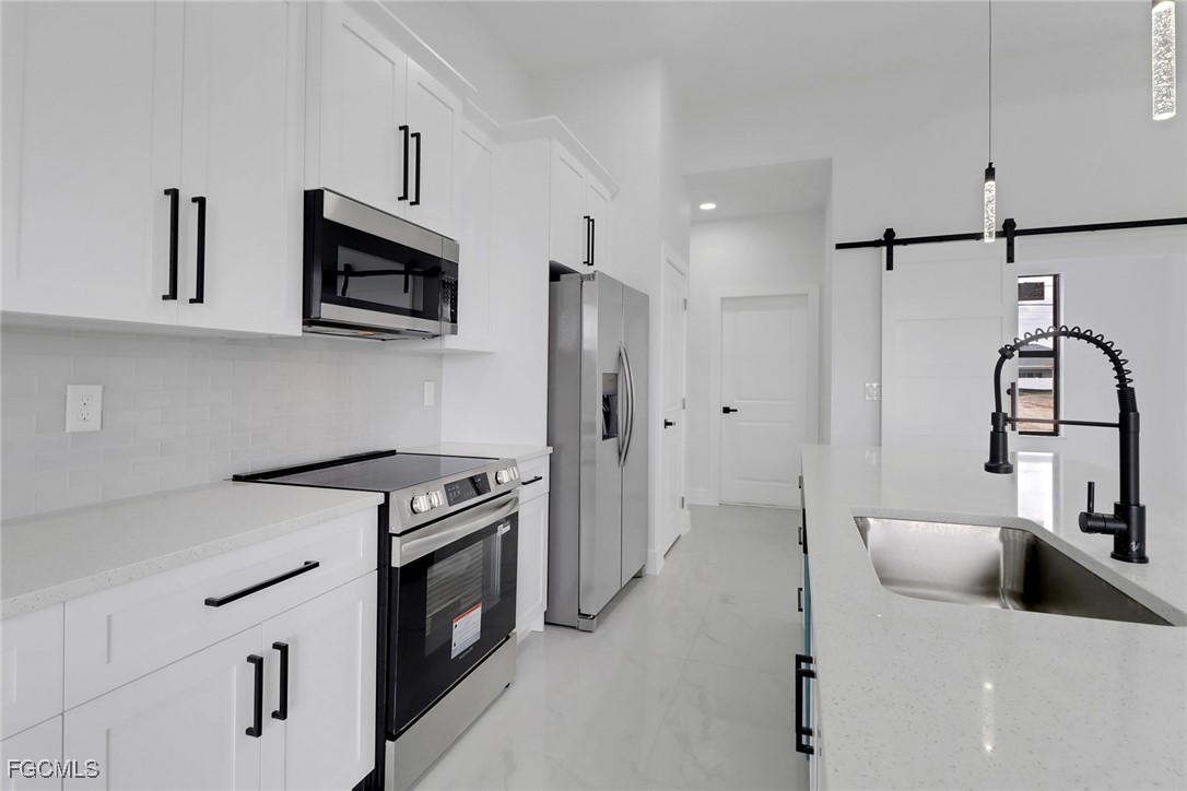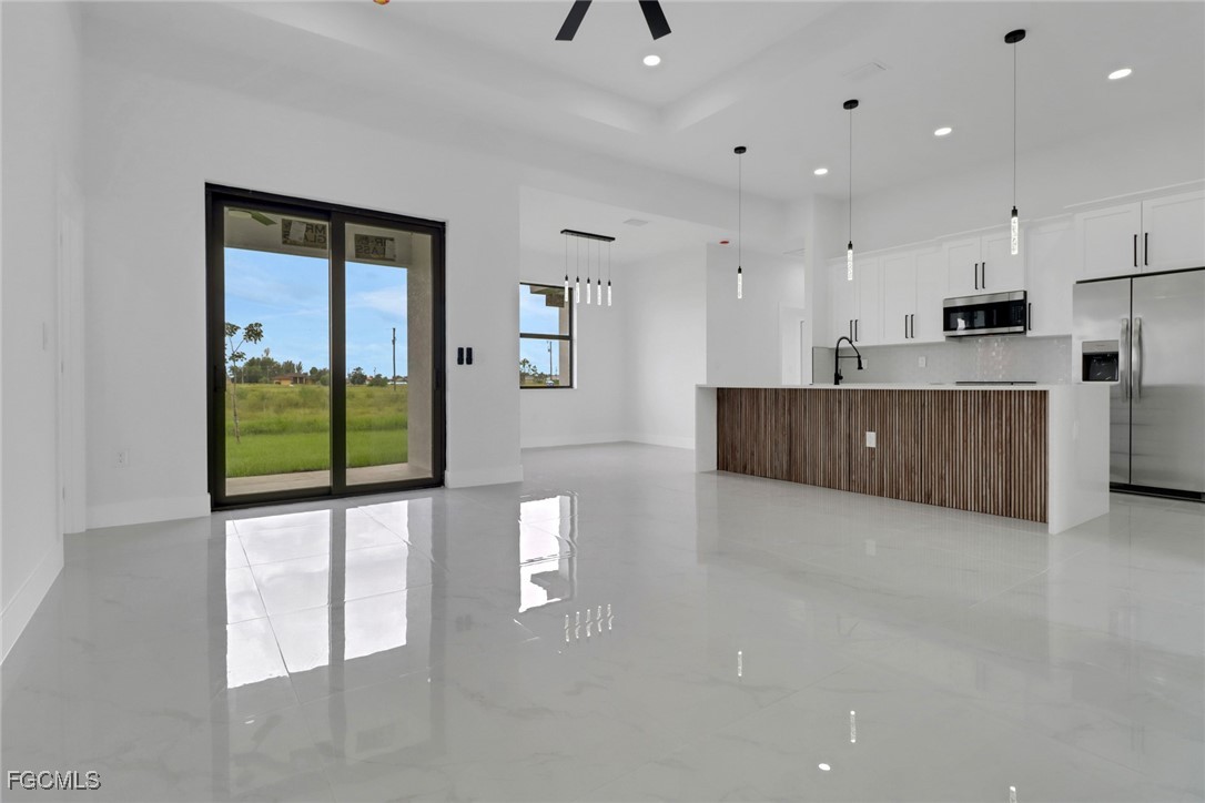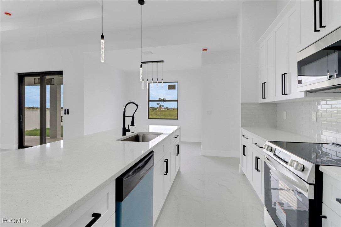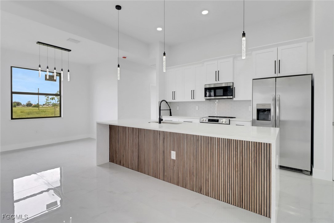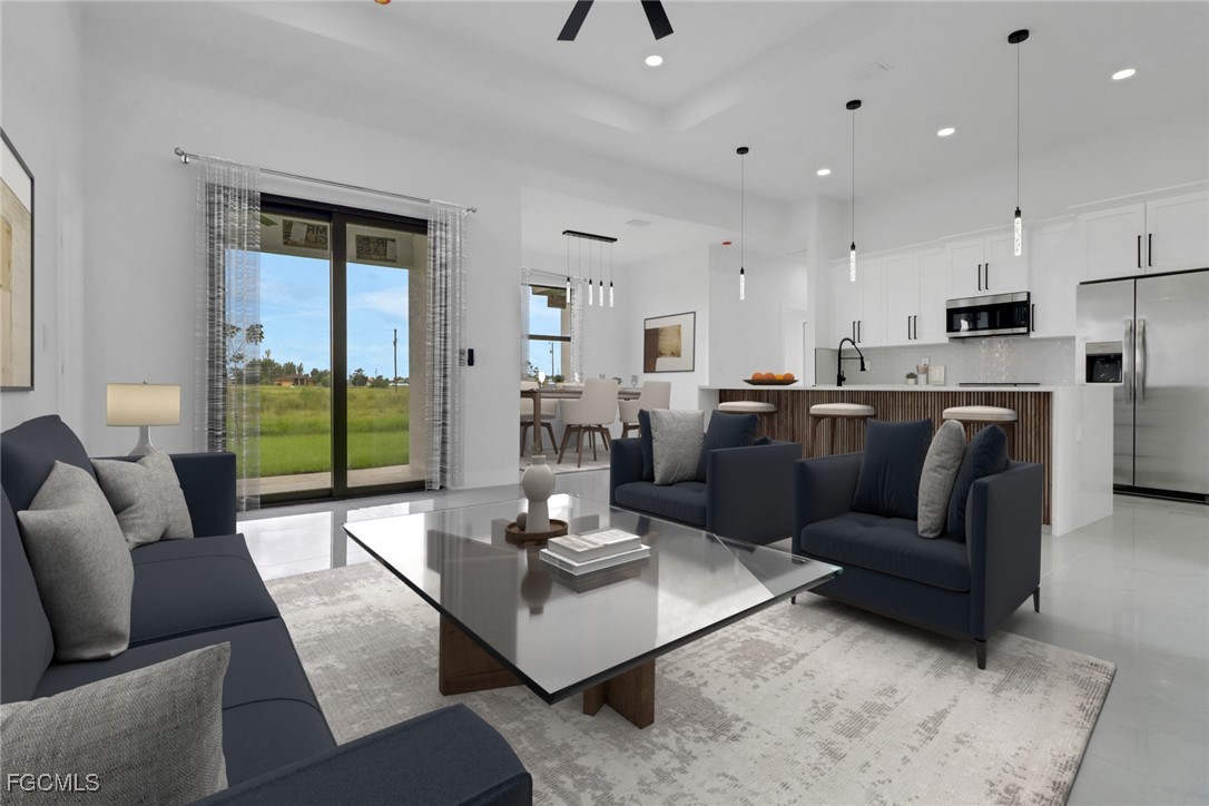 Welcome to your dream home in Cape Coral! This stunning single family home boasts 3 bedrooms, 2 bathrooms, and a 2 car garage, perfect for a growing family or those who love to entertain. The office space provides a quiet retreat for working from home or studying. The kitchen features granite counters, stainless steel appliances, and 42" cabinets, making it a chef's paradise. The tile flooring throughout the home adds a touch of elegance.High ceilings and impact windows and doors create a bright and airy atmosphere, while LED lights and ceiling fans add a modern touch.The master bathroom is a true oasis with a soaking tub, shower, and granite countertops. The walking closets with custom organizers ensures that your wardrobe stays organized and clutter-free.Step outside to the tile lanai and enjoy the Florida sunshine in your private backyard with a sprinkler system for easy maintenance. This new construction home has everything you could want and more, making it the perfect place to call home in Cape Coral. Don't miss out on this opportunity to live in luxury and comfort! *one or more pictures are virtually staged.