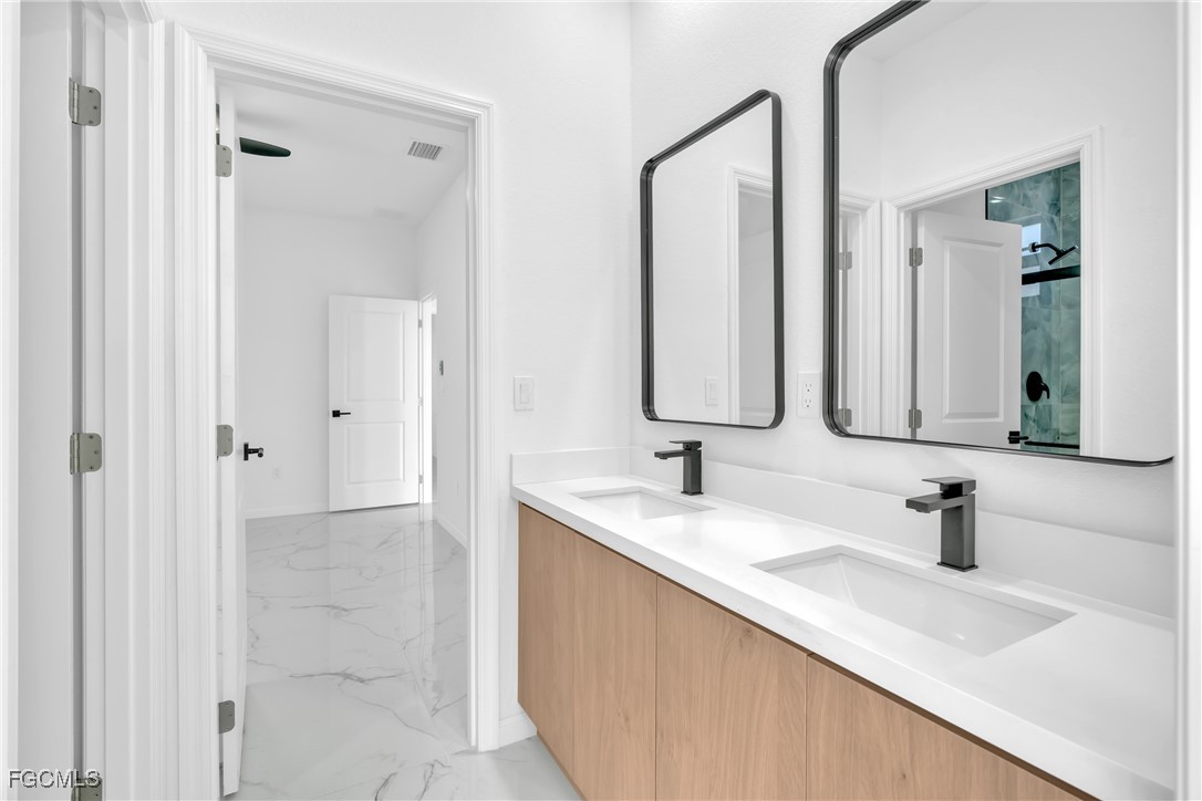 This modern new construction home blends clean architectural lines with a bright, open layout designed for comfort and functionality. Polished tile flooring, recessed lighting, and tray ceilings create a smooth flow throughout the main living areas. The kitchen anchors the space with a waterfall island, modern cabinetry, stainless steel appliances, and designer lighting, making it ideal for hosting or daily living. The primary suite serves as a private retreat with a well-appointed bathroom featuring dual sinks and a tiled walk-in shower. Spacious secondary bedrooms and a large backyard provide flexibility for a variety of lifestyles. Located in a developing Lehigh Acres area with easy access to major roads and local amenities.