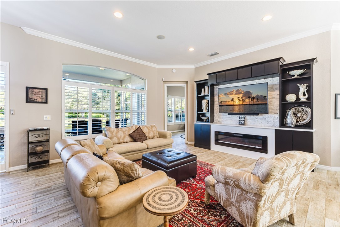 The open-concept great room boasts soaring ceilings, abundant natural light, and serene views of the pond and fountain. Faux wood tile flooring throughout ensures a clean, durable, low-maintenance lifestyle.