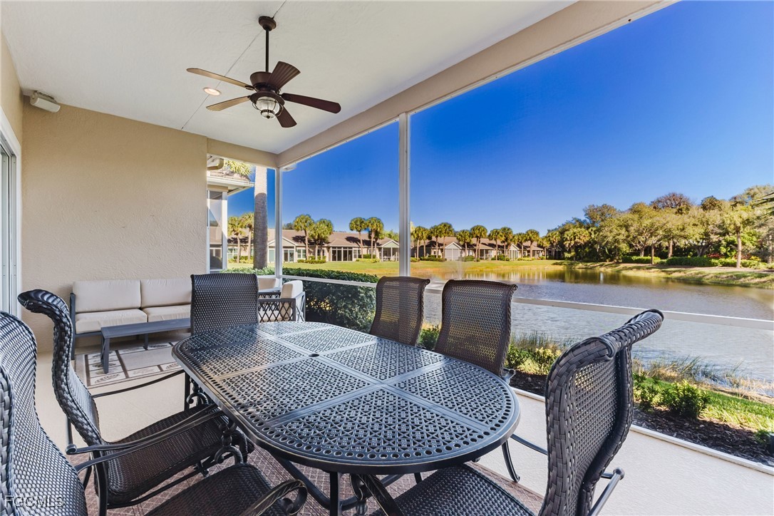 The screened lanai has dining and sitting areas overlooking the tranquil pond and fountain with southwest exposure for breathtaking sunsets, enhanced by zoned surround sound speakers that let you enjoy music inside, by the pool, and/or on the lanai.