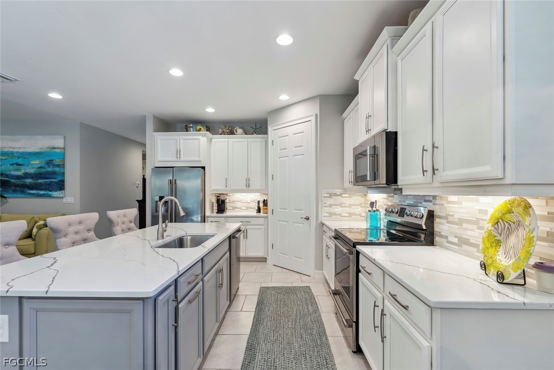 Welcome to this stunning 4-bedroom, 2-bath pool home located in the highly sought-after Egret’s Landing neighborhood of Naples Reserve. From the moment you arrive, the builder’s glass front door opens to an inviting open-concept layout with ceramic tile throughout, creating a bright and cohesive living space designed for both comfort and entertaining.