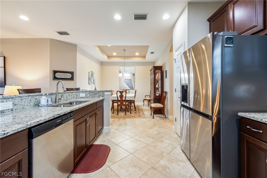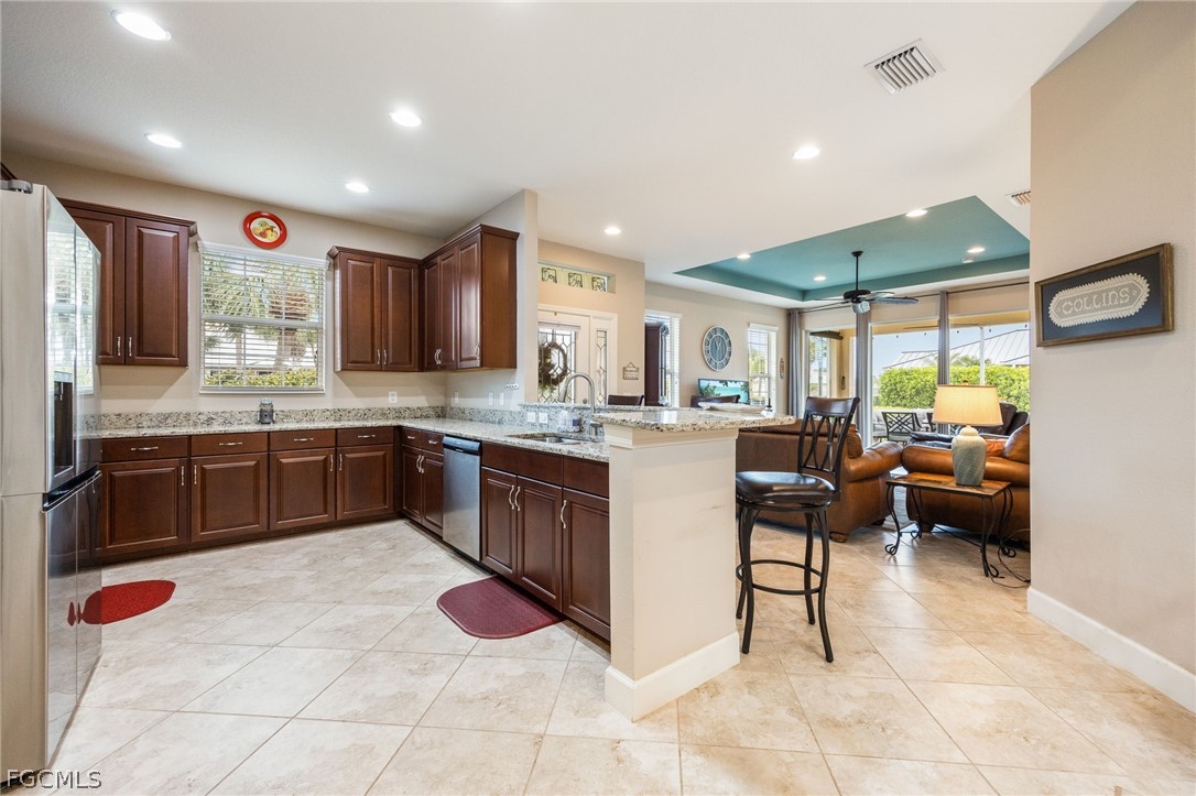 Welcome to a life of relaxation in Sandoval! This twin-Villa home offers a spacious 1,542 SF living area with two bedrooms and a den, two full bathrooms, and a convenient two-car attached garage. Enjoy an open living room with vaulted ceilings and stunning views from the back sliding glass doors that open to the screened-in patio lanai. The kitchen boasts plenty of cabinets and counter space, complete with bar-top seating and easy access to the dining room. With two bedrooms and a cozy office/den area, you’ll have just the right amount of space. The owner’s suite is a bright haven with large windows, and the en-suite bath features dual vanities and a walk-in shower. The well-appointed guest suite is perfect for visitors and family. The beautiful screened-in patio lanai is an extension of your living space, allowing you to fully embrace the Florida lifestyle with great outdoor living space overlooking the backyard.
