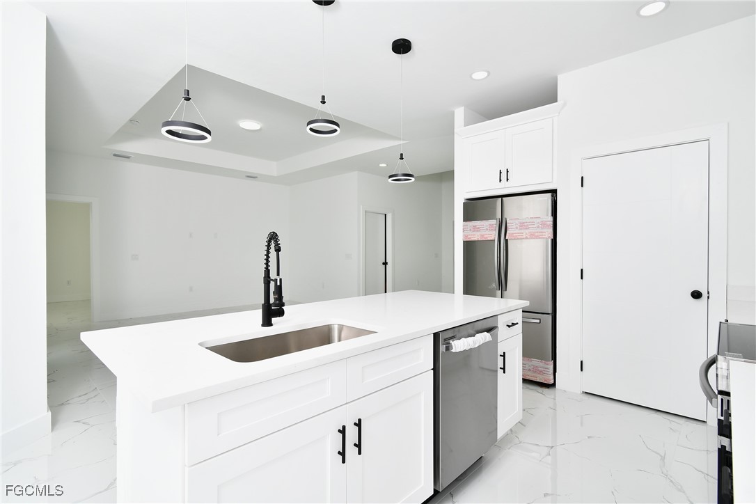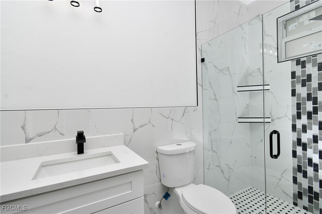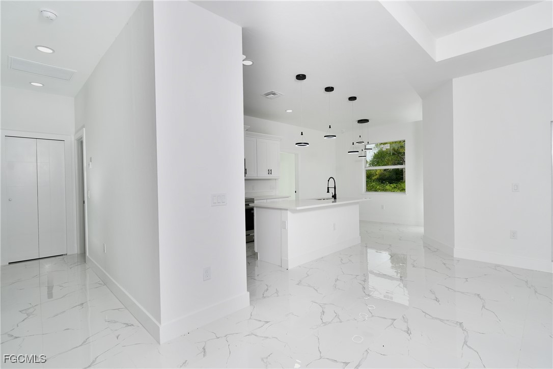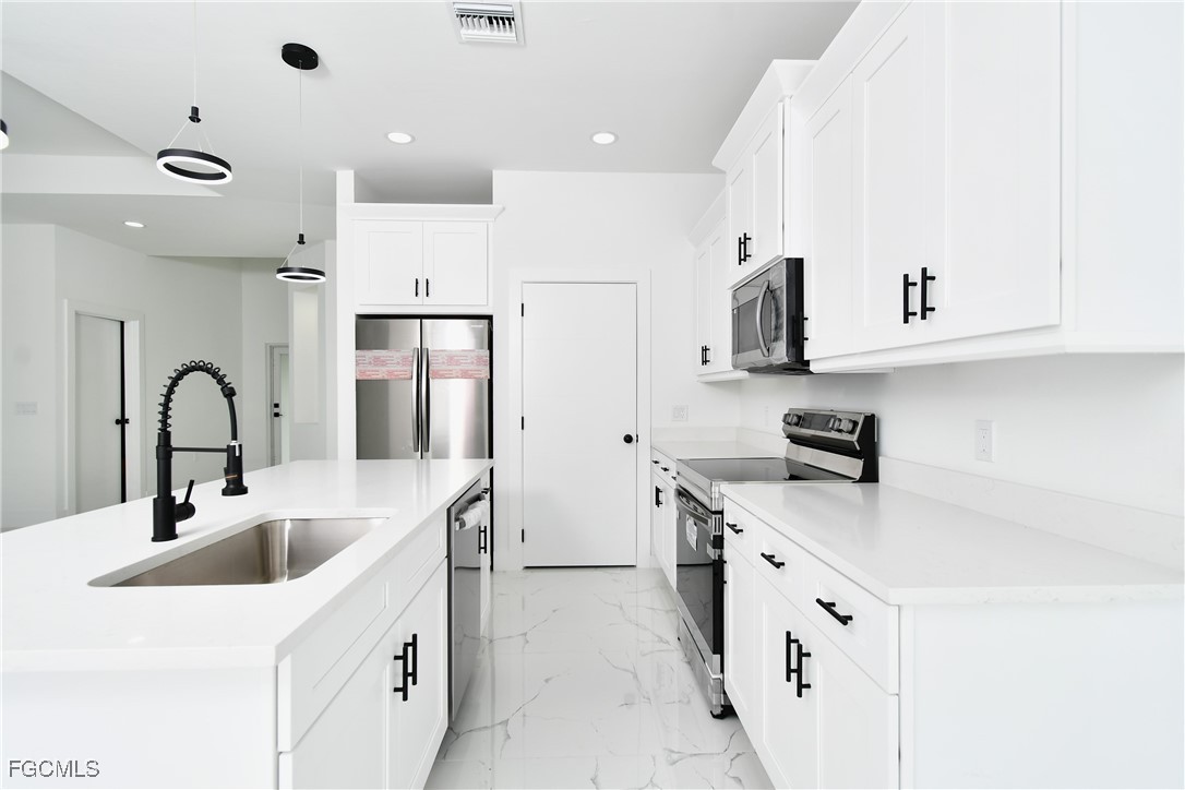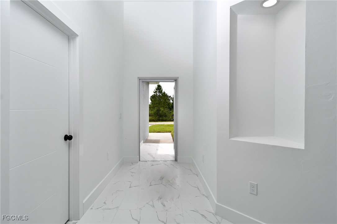 Seller is offering $15,000 towards Buyers closing cost. Centrally located, this is a gorgeous brand new 4/3 and double car garage home.This single family residence offers the perfect blend of comfort and security. Step inside to discover a beautifully appointed interior where natural light floods through the impact hurricane windows and sliders providing both safety and peace of mind during stormy weather. No expense has been spared in the construction and attention to detail. Double frosted 6 feet high impact doors lead to a beautiful open floor plan with 10 ft. cathedral ceilings. Imported ceramic floors throughout, gourmet kitchen with lots of cabinet space and a huge island all with white sparkly quartz counter tops, beautiful and modern pendulum lights, over sized undermount kitchen sink and top of the line stainless steel appliances. Huge master with his and hers walk-in closets, double sink with matching quartz and an astonishing shower tiled to ceiling with enclosed glass doors. Guest bathroom offers a single sink with matching quartz and 3/8" glass enclosure. Lanai overlooking yard with plenty of room for a pool. Automatic sprinklers and much more. COME SEE IT BEFORE ITS TOO LATE!!