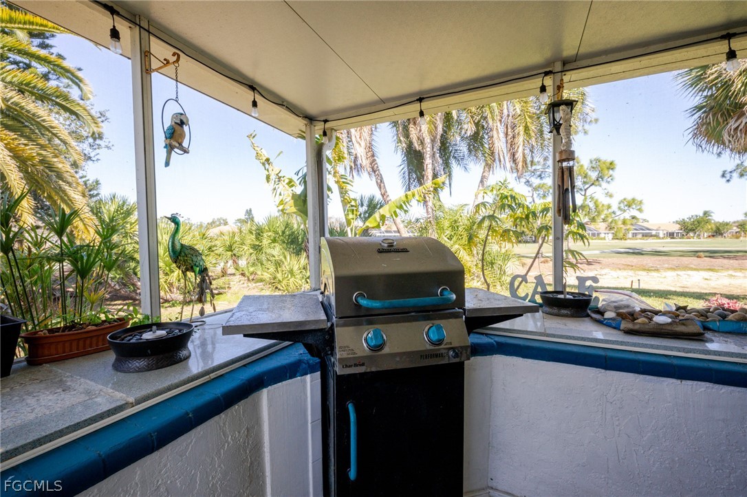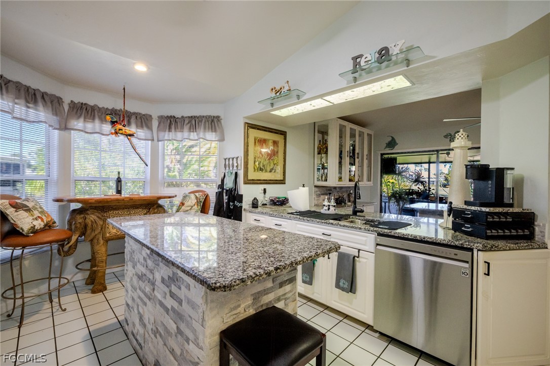 This Villa Real model home is just perfect as your full-time residence or winter retreat. Upon entering you will be impressed with the stunning leaded glass door, spacious living room, vaulted ceiling and a skylight that lets all the gorgeous Florida sunshine in. The kitchen features granite countertops, white cabinetry and a beautiful bay window flooding the kitchen with natural light. Custom cabinets in the dining area and custom dining table give one of the largest eat in kitchens in the Glen. This beautiful home has three bedrooms and two baths, with a generously sized and private guest suite. Updated light fixtures, custom California closets and computer cabinets built in the guest bedroom give you storage and more storage. Perfect for entertaining or enjoying time alone, this home has an enclosed Florida room or attached screened lanai giving all different options for your ideal Florida living lifestyle to enjoy endless lake and golf course views. Herons Glen is the area's most amenity rich community with Championship golf, tennis, pickleball, bocce, shuffleboard, resort style pool/spa, clubhouse with community and activity rooms, billiards, pro-shop and a full-service restaurant and bar! Come live your dream today!
