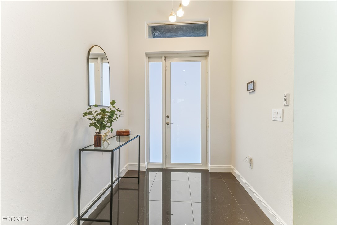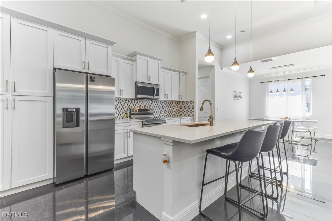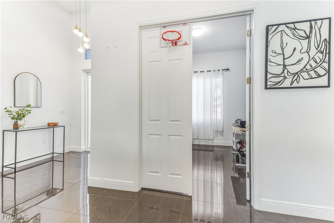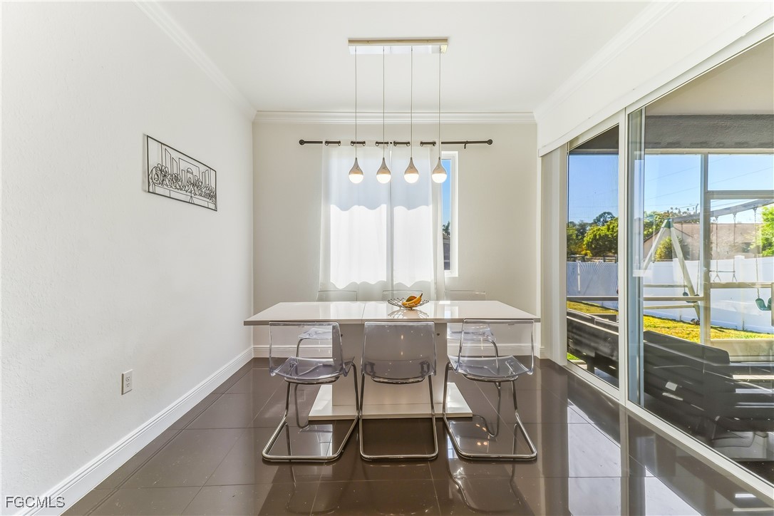 Beautifully maintained 3-bedroom plus den, 2-bath charming home situated on a desirable corner lot in a prime location just minutes away from major intersections such as SR82, I75 and shopping centers like Walmart and a variety of restaurants. This thoughtfully designed home features vaulted ceilings, crown molding, and eight foot doors creating a bright and spacious feel. The kitchen is both stylish and functional, showcasing granite countertops with soft closing cabinet doors and tiled backsplash. The open layout flows seamlessly to the living area and out through double doors to the tiled lanai. The primary master room offers a his and hers closets, master bathroom features a dual sink vanity, tiled shower and gorgeous tub. The den, accented with charming barn doors, provides flexible space ideal for home office or media room.