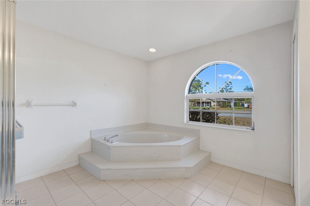 The primary suite serves as a private retreat and features a spacious bathroom with dual-sink vanity and an elevated soaking tub positioned beneath an arched window. Two additional bedrooms provide flexibility for family, guests, a home office, or hobbies. The guest bathroom features a Safe-Step walk-in tub. The roof was replaced in 2017, and AC 2016.