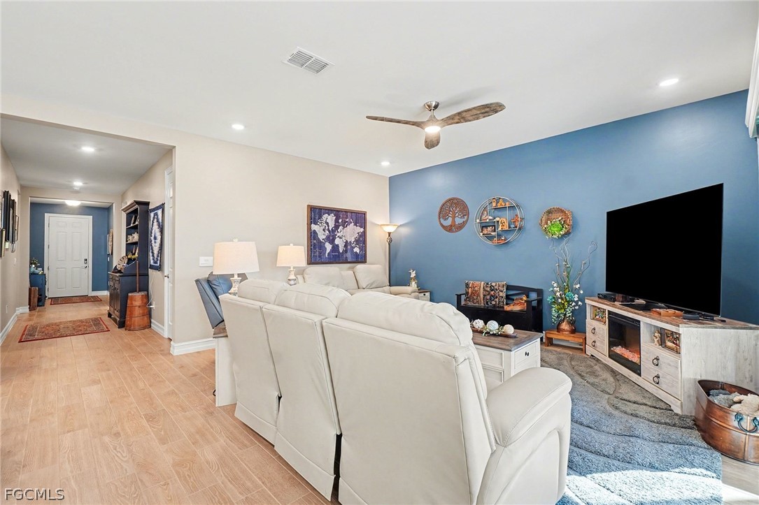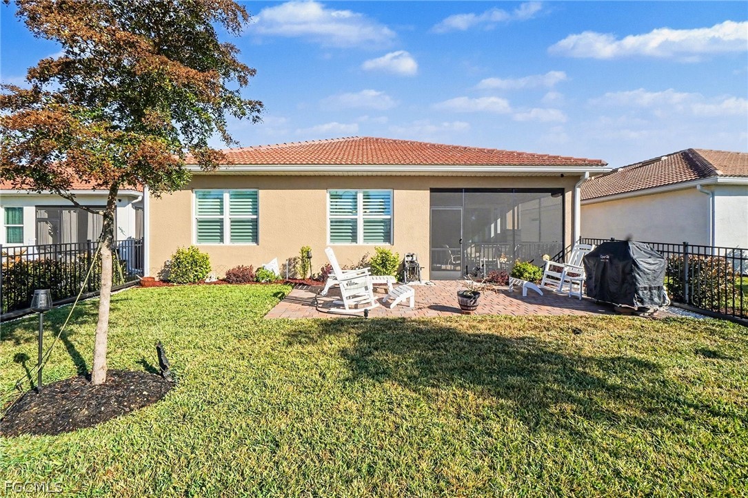 PARK THE GOLF CART, STORE THE TOYS, INVITE THE FRIENDS. THIS HOME IS BUILT FOR THE GOOD LIFE (large tandem 2.5 car garage and sizeable fenced back yard). This beauty makes a strong first impression with standout curb appeal featuring a widened driveway with sealed pavers, stone accents, mature landscaping, and upgraded cement curbing that frames the property beautifully. The screened front entry creates a welcoming arrival and the perfect breezy spot to pause and chat. Inside, natural light fills the bright, open layout, highlighting a pleasing color palette, plantation shutters, and upgraded fans and lighting throughout. Three sliding glass doors are finished with accordion blinds and decorative molding for a polished, tailored look. The kitchen is both stylish and complete with cabinet crown molding, a coordinated backsplash, and sleek quartz countertops that tie the space together with a clean, modern finish. The primary suite features a tray ceiling, private bath, and a walkthrough closet that connects directly to the finished laundry room for everyday convenience. Both bathrooms include upgraded shower heads for a spa inspired touch. Built with comfort and confidence in mind, the home includes impact resistant doors and windows plus wiring for a whole home generator, giving you strong storm protection and added peace of mind year round. A smart home package is installed and available for the new owner to activate service. The deep tandem 2.5 car garage gives you the extra room everyone wants for a golf cart, workshop, storage, or hobby space. Out back, enjoy a screened lanai with decorative railing, a bonus outdoor patio, and a fenced yard ready for pets, play, and relaxed evenings outdoors. Magnolia Landing delivers the lifestyle bonus with golf, dining, and a lively community calendar, making it easy to stay active, social, and right at home.