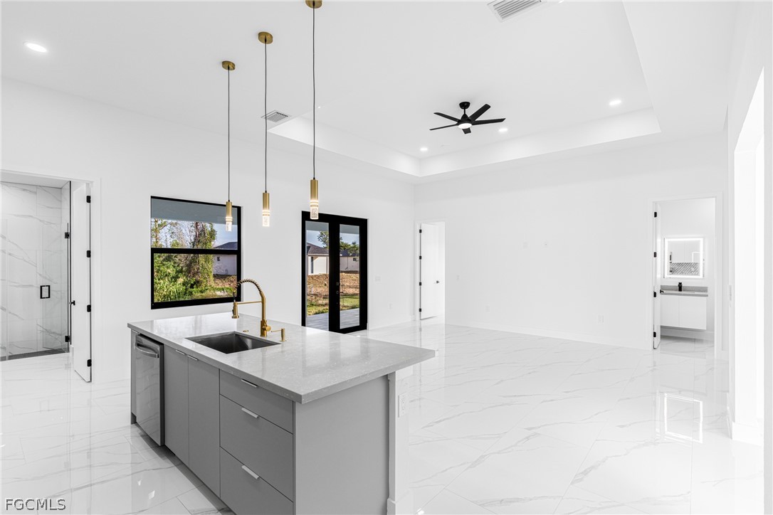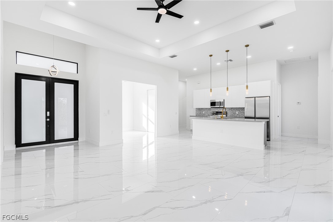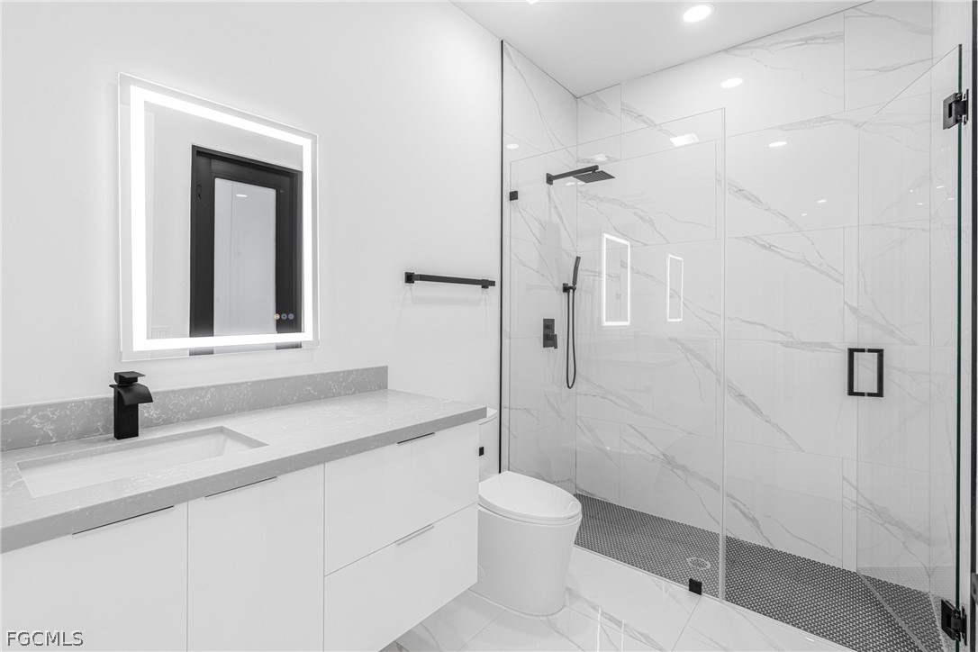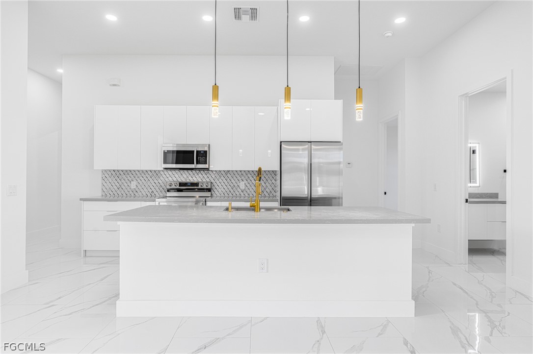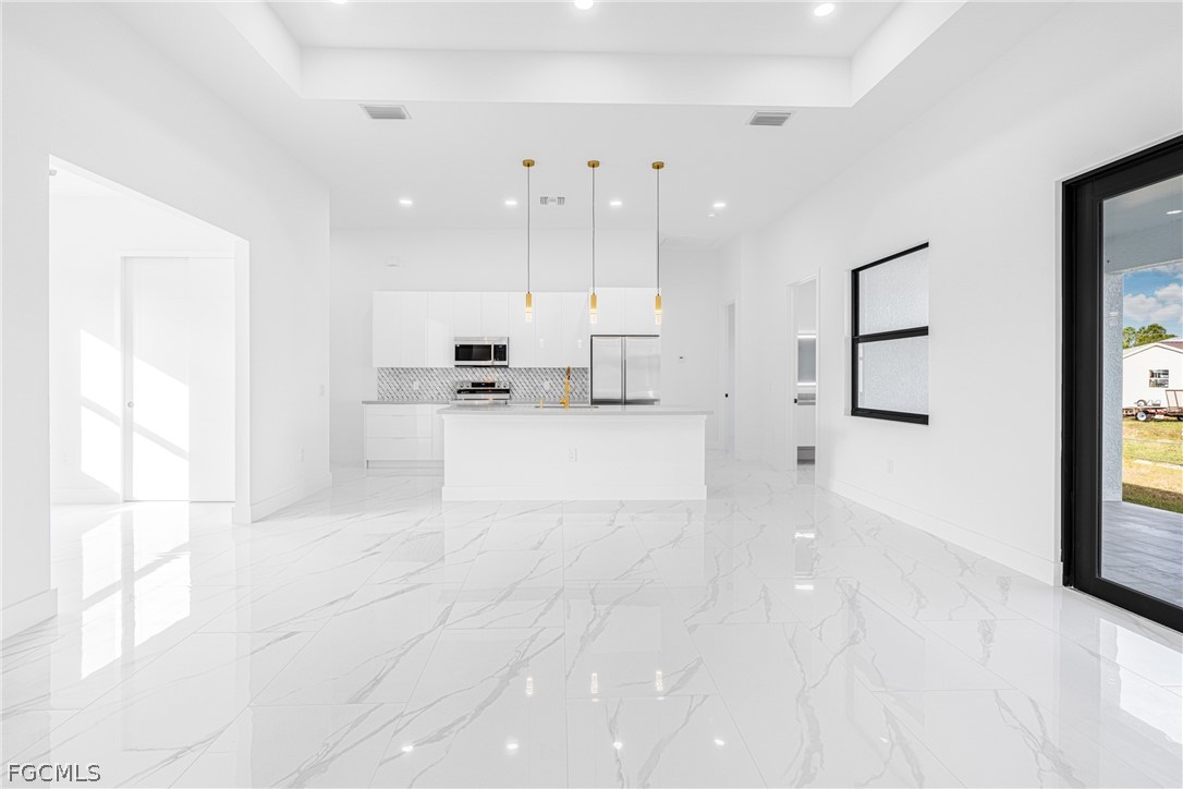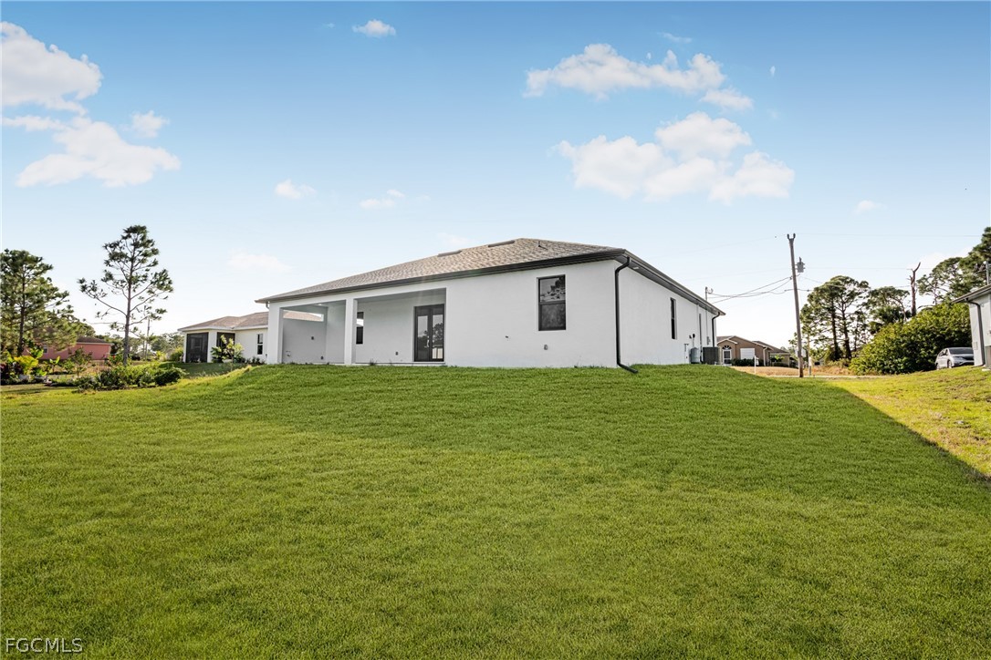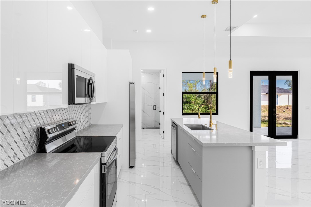 Introducing a stunning example of contemporary luxury living: this beautiful new construction boasts a modern aesthetic that is both chic and functional. Step into the spacious kitchen, featuring a sleek island with high-end stainless-steel appliances and quartz countertops, perfect for cooking and entertaining. European-style acrylic cabinets provide ample storage, complementing the clean, minimalist look. Throughout the home, porcelain tile flooring adds elegance and durability. In the bathrooms, LED light mirrors combine style with practicality for a truly indulgent experience. With four bedrooms and two and a half bathrooms, including a master suite with his and her sinks and an elegant tub, comfort and luxury abound. From the floating modern vanities to the acrylic European style closet doors, every detail has been carefully curated for modern living at its finest. And with an extended lanai and sleek finishes, calling this paradise is an understatement.