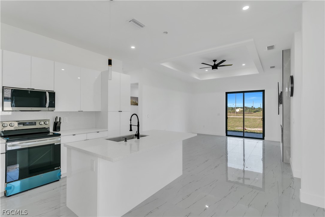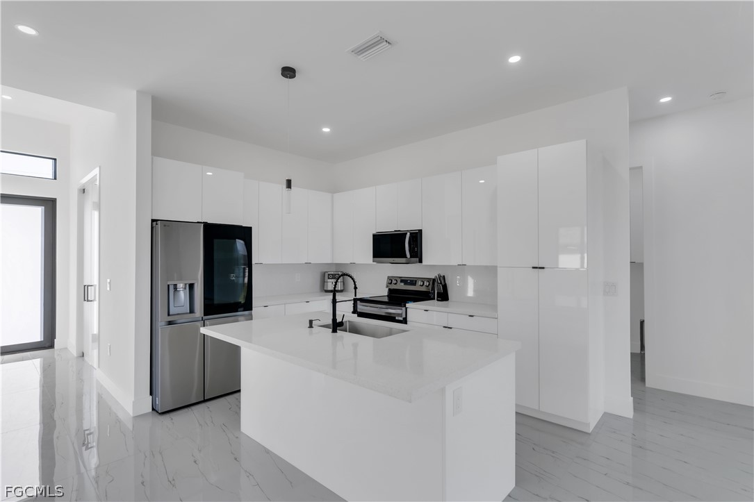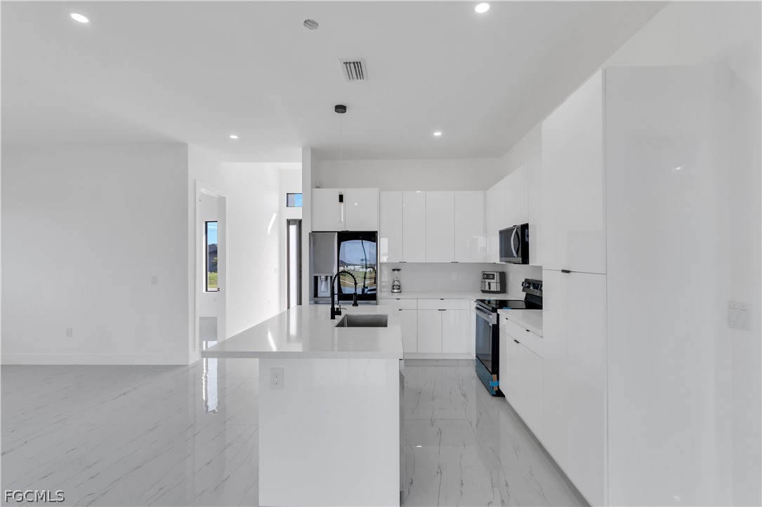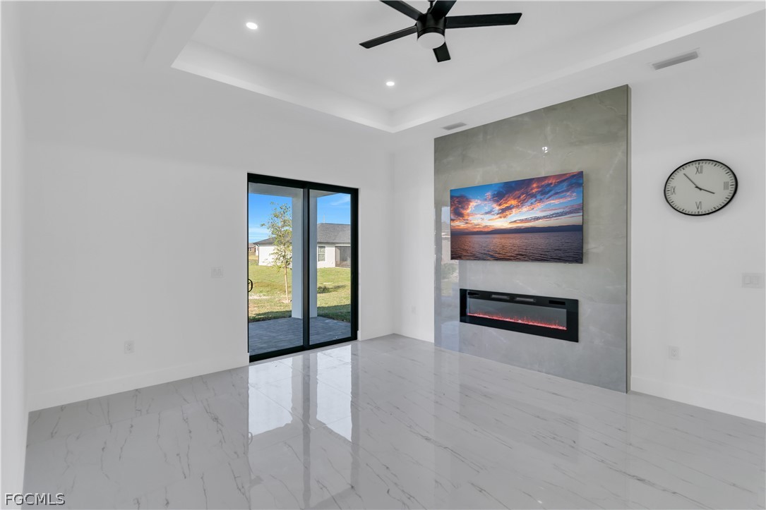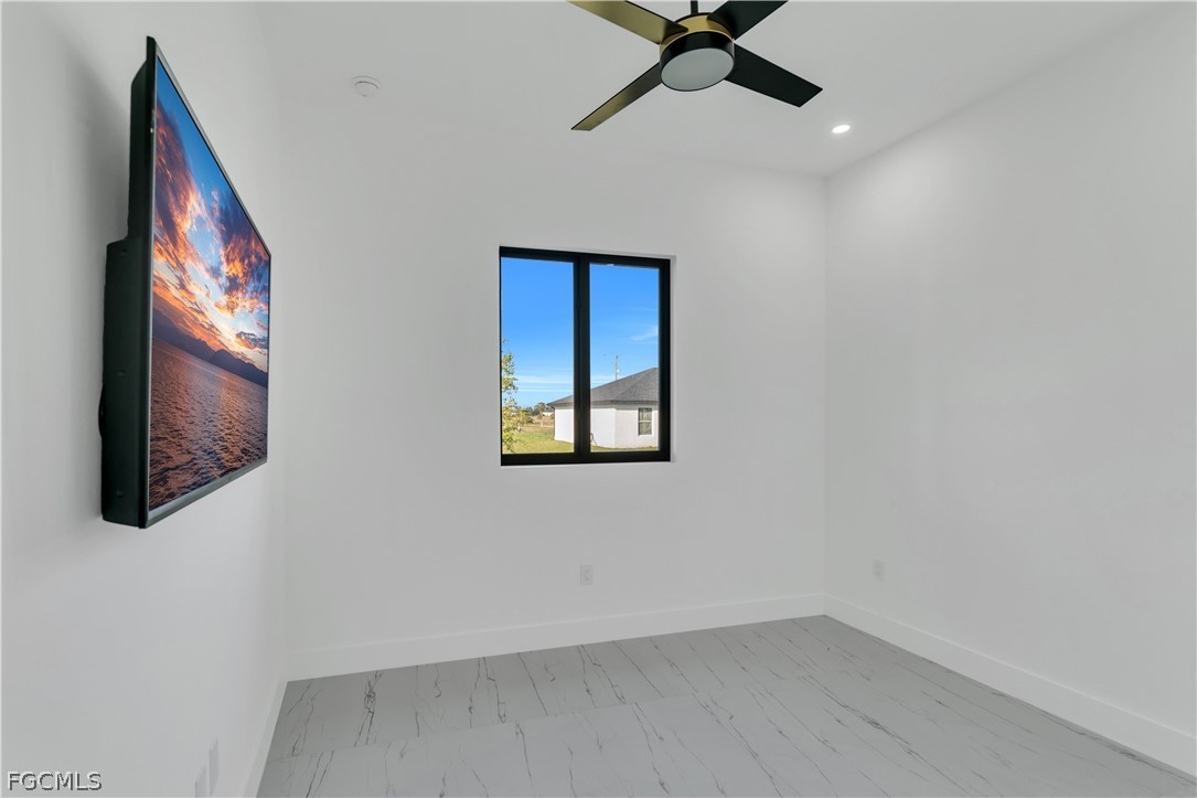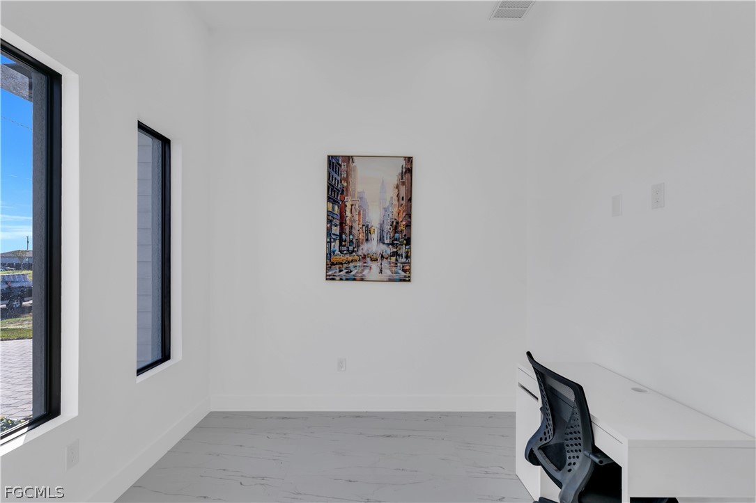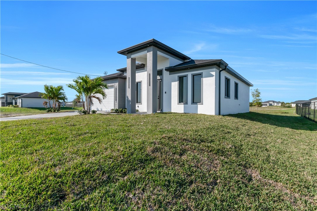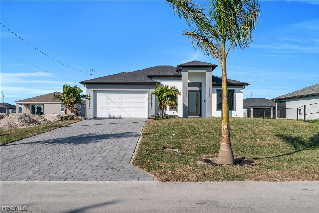 Beautiful new construction home in a desirable NW Cape Coral location! This stunning property offers 3 spacious bedrooms plus a bright office/den, featuring large windows that flood the space with natural light and elegant French-style glass doors, perfect for a home office or flex space.
