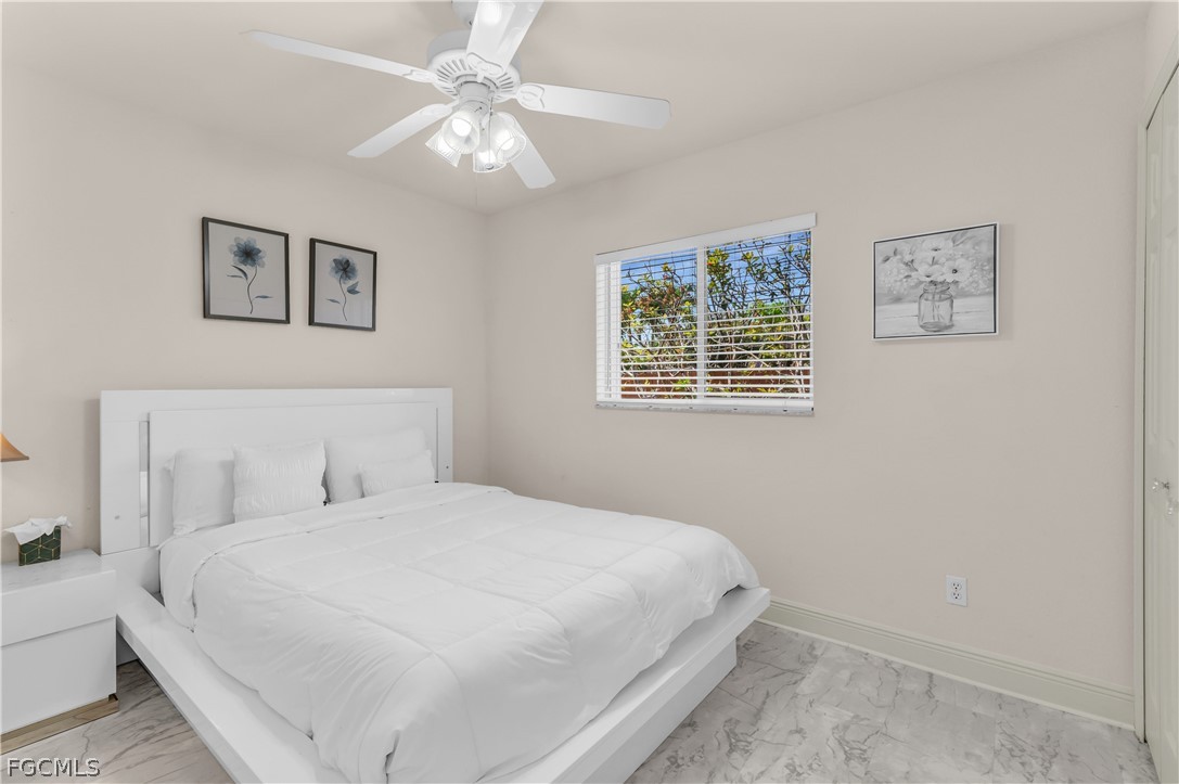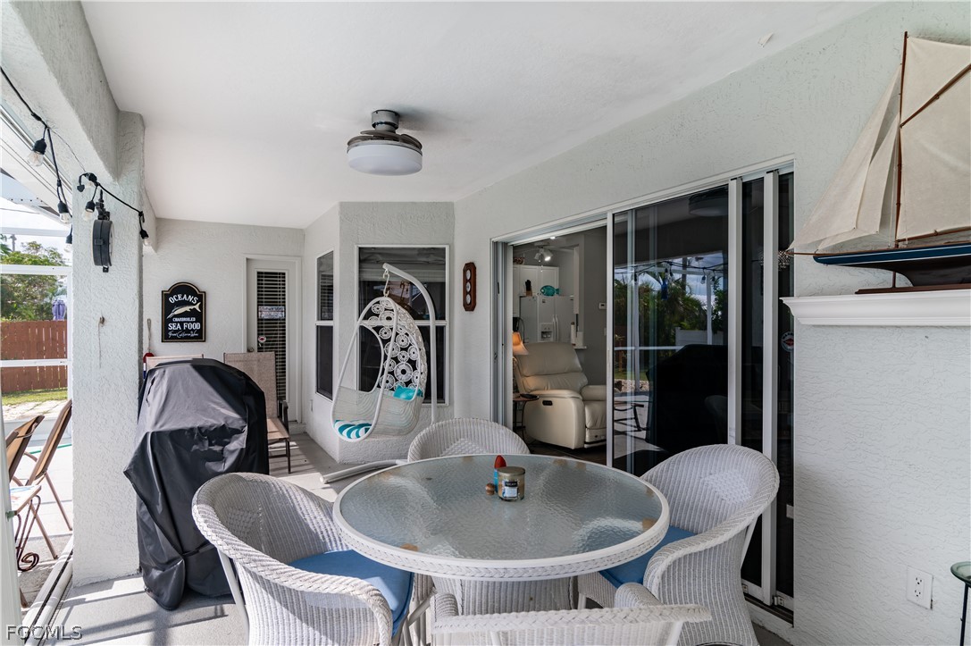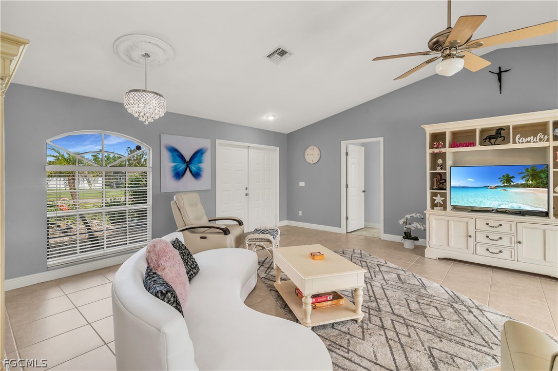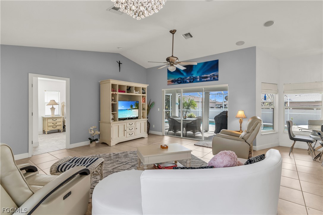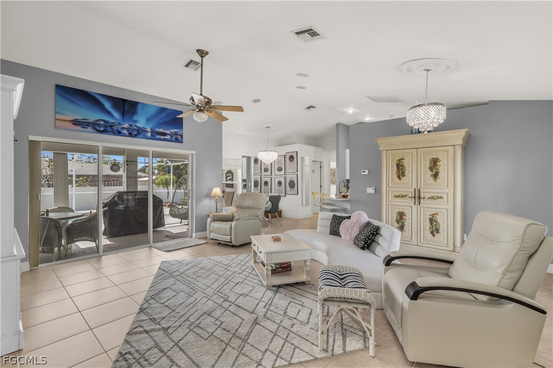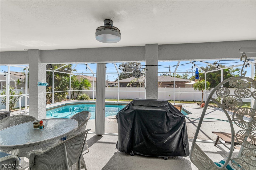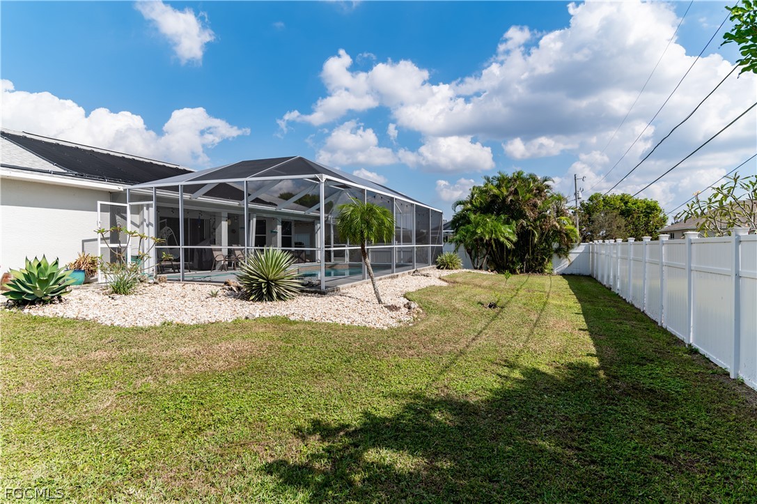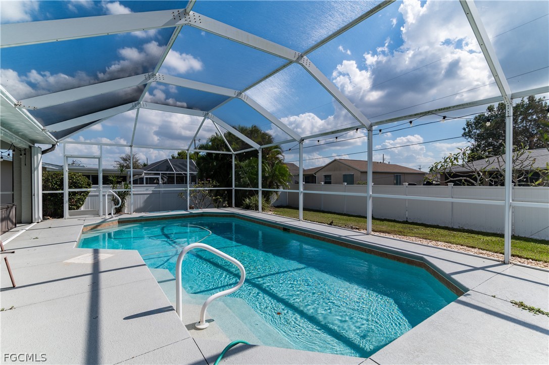 Located in the heart of Cape Coral, this charming pool home features 3 bedrooms and 2 bathrooms, with an open-concept living area ideal for entertaining. The property boasts ample outdoor living space, including a spacious screened lanai and pool area, all within a secure fenced yard. Inside, you'll find tile flooring throughout the living area and porcelain tile in all bedrooms and the laundry room. The master bathroom is equipped with his and her closets, a double sink, and a shower. Additional highlights include storm shutters and lush landscaping. This home is conveniently situated just minutes from downtown Cape Coral, Tarpon Point, Cape Harbor, Publix Shopping Center, Super Walmart, and various restaurants, with all assessments paid. Home is currently utilized as a vacation rental (Airbnb), providing an excellent income opportunity.