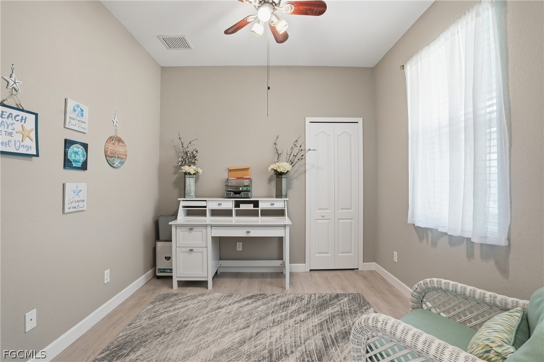 This well maintained lakefront home offers a relaxed Florida lifestyle with peaceful water views and a thoughtfully designed layout featuring three bedrooms plus a versatile den. The open, light filled living spaces create an inviting atmosphere that works perfectly for both everyday living and entertaining. The kitchen is centrally located with ample cabinetry and counter space, flowing seamlessly into the main living area to keep everything connected. The primary suite provides a comfortable private retreat with serene lake views, while the additional bedrooms are well sized and flexible. The den adds valuable bonus space ideal for a home office, media room, or hobby area. Large sliding doors open to a tranquil outdoor setting overlooking the lake, where you can enjoy sunsets, wildlife, and the calming surroundings. With neutral finishes throughout and a move in ready feel, this home offers a wonderful opportunity for buyers seeking space, scenery, and long term comfort in North Fort Myers.