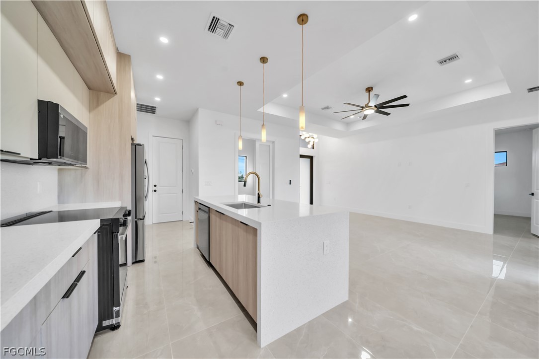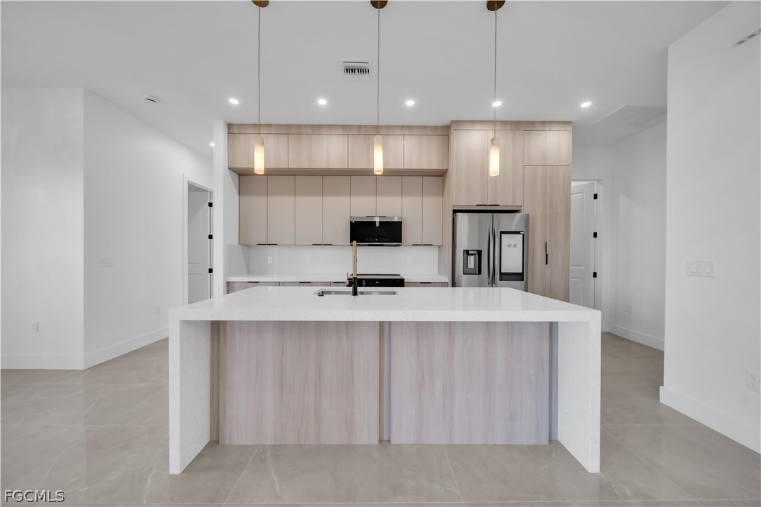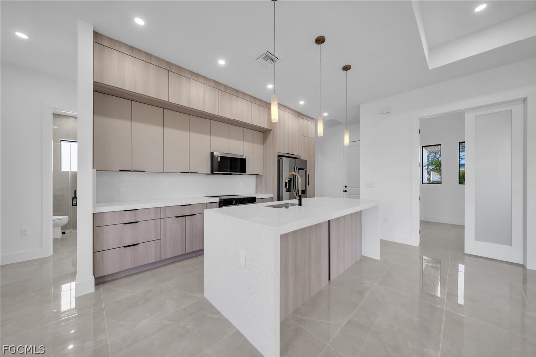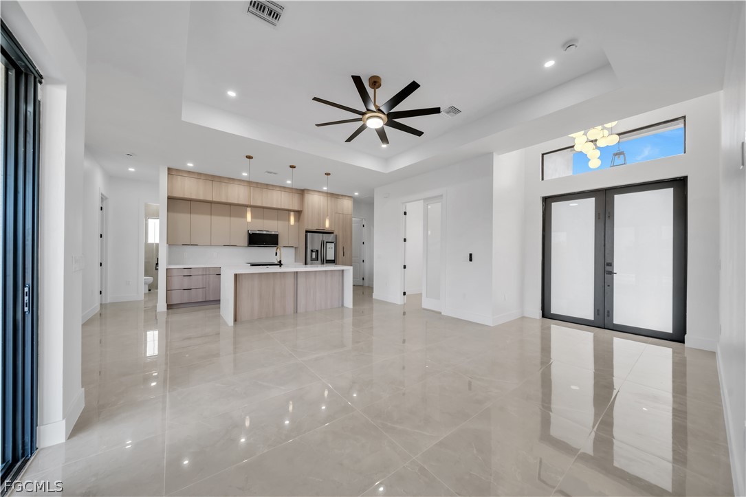 Luxury new construction located in a central area with quick access to major avenues, on city water and sewer and featuring a relaxing canal view. This home offers 3 bedrooms plus a den/office, 2 full bathrooms, high ceilings for an open and energy-efficient feel, and upscale finishes throughout, including elegant alabaster light fixtures. The modern kitchen is designed with premium materials and complemented by smart appliances and an outdoor kitchen, perfect for entertaining. All bedrooms feature custom walk-in closets, the garage includes an epoxy-finished floor, and the property is equipped with impact-resistant windows and doors. Builder warranties are included, and the home is located outside the flood zone, meaning no flood insurance required, offering long-term savings.
