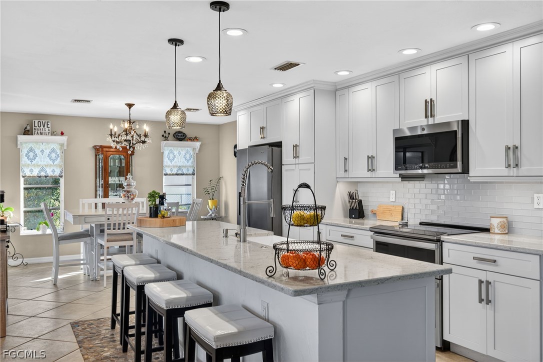 Beautiful Sailboat-Access Gulf Home , No Bridges, Direct Route to Open Waters! Experience the best of waterfront living in this stunning sailboat-access home offering a short ride to the Gulf. Perfectly situated just minutes from Tarpon Point Marina, Cape Harbor Marina, and downtown Cape Coral, this home embodies the ideal Southwest Florida lifestyle. Step inside and be greeted by breathtaking views of the pool and canal the moment you enter. The newly remodeled kitchen shines with bright quartz countertops, a spacious island, and abundant storage, complemented by a stylish butler’s pantry with a barn door. Recent updates include a new roof, new pool cage, and updated decking (2024). The primary suite features direct pool access, a walk-in closet, dual vanities, and walk-in shower. Guest bedrooms are located separate from the primary and have easy access to their own bathroom. Three sets of double glass hideaway sliders open to an extended lanai and heated pool, the perfect space for entertaining complete with an oversized granite bar featuring a waterfall edge. Set on an extra-wide lot, this property includes 120 feet of seawall, a large dock with captain’s walk, and a 12,000 lb. boat lift. Just imagine relaxing in your yard, watching a dolphin swim by! The circular driveway provides easy access to the two-car garage and can accommodate six or more vehicles when entertaining. Located on one of Cape Coral’s most picturesque palm-lined streets, this home offers a peaceful, resort-like atmosphere beautifully maintained by the nearby Westin Resort.