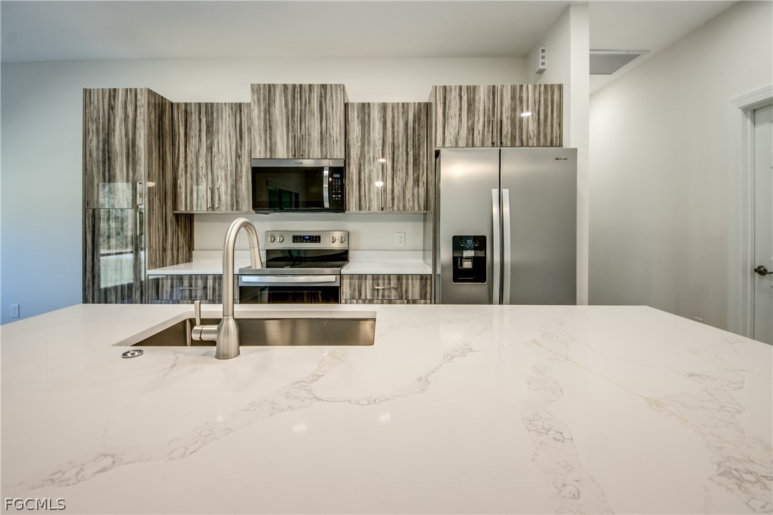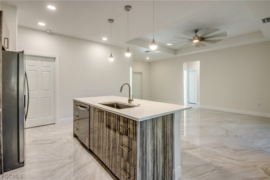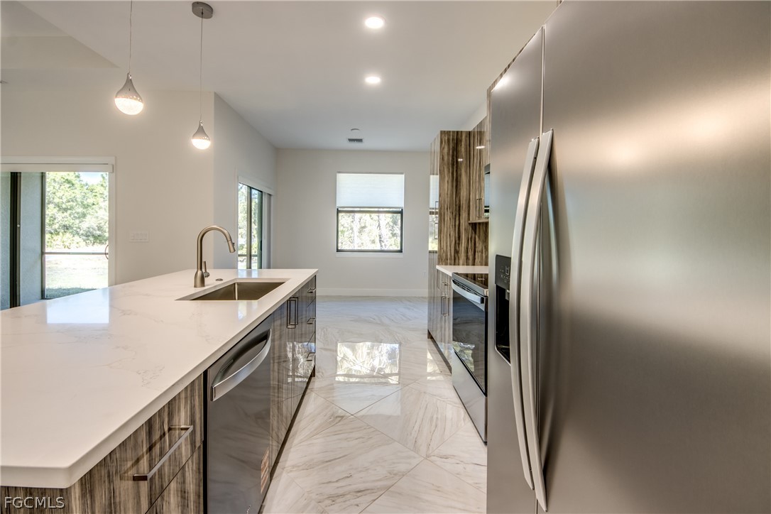 The open-concept floor plan showcases an inviting entry foyer and desirable split-bedroom layout. The kitchen serves as the centerpiece of the home, featuring solid wood soft-close cabinetry, quartz countertops, a full-height pantry cabinet, a stainless steel appliance package, and an oversized island with snack bar seating. A separate formal dining area provides additional space for entertaining.
