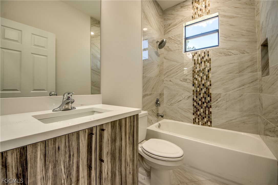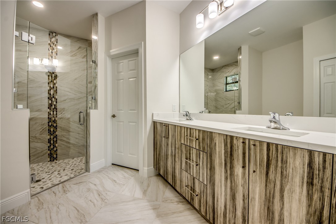 The spacious primary suite includes a large walk-in closet, dual sinks with matching solid wood vanities, and a beautifully tiled walk-in shower. Secondary bedrooms are generously sized, and all bathrooms feature custom tile work and quartz surfaces.