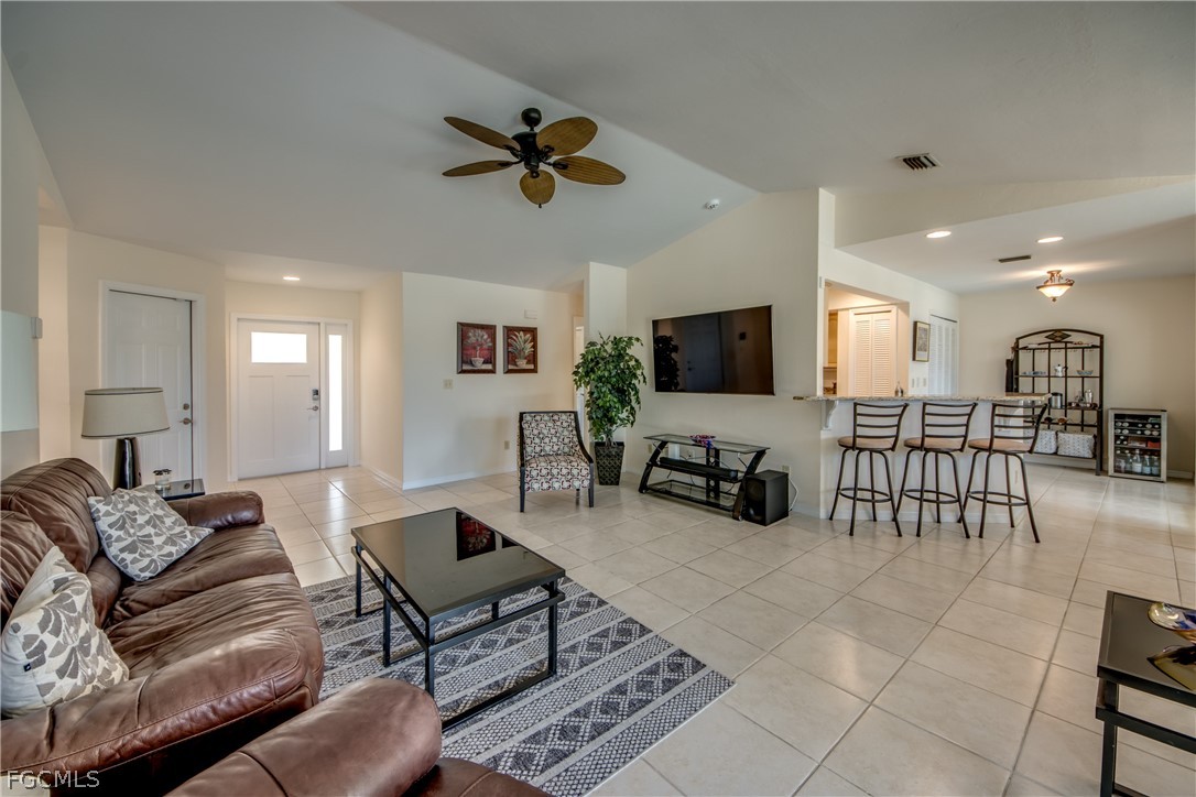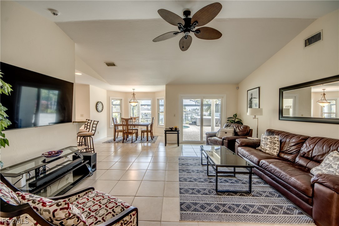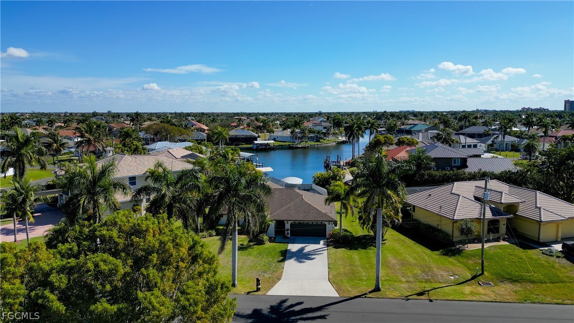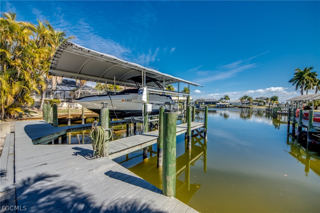 Prime Intersecting Canal Views with Walkable Cape Harbour Location-Positioned on a prime Gulf access intersecting canal, this waterfront home captures a stunning long view straight down the canal and offers excellent boating access .From the moment you step inside, the connection between indoor and outdoor living is clear. Vaulted ceilings create an open, airy feel, allowing the home to live much larger than expected. Thoughtfully designed to maximize both space and scenery, the primary bedroom, living room, dining area, and breakfast nook all enjoy beautiful waterfront views. The kitchen features tray ceiling, stainless steel appliances, granite countertops, a breakfast bar, pantry, and a sunny breakfast area overlooking the water. Tile and laminate flooring run throughout for a clean, cohesive look and easy maintenance. The primary suite offers tranquil water views, a walk-in closet, and a beautifully remodeled bath featuring a walk-in shower with multiple shower heads and a built-in vanity/makeup area thoughtfully integrated into the countertop. Recently added hurricane-rated impact windows and doors provide peace of mind, added protection, and energy efficiency. Sliders from the living room and breakfast nook open to a full-width lanai with picture window screening that perfectly frames the canal. The outdoor living space is truly inviting, complete with a saltwater pool with electric heat and a relaxing spa, plus plenty of room for lounging and entertaining. The dock is equipped with a captain’s walk, boat lift, and lighting — ready for effortless days on the water and evening sunset cruises. Located in a lovely neighborhood ideal for walking and biking, with the ability to stroll or ride to Cape Harbour for waterfront dining, shopping, and entertainment — this home delivers the Southwest Florida waterfront lifestyle you dream about.