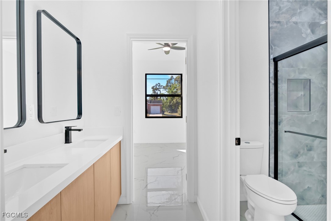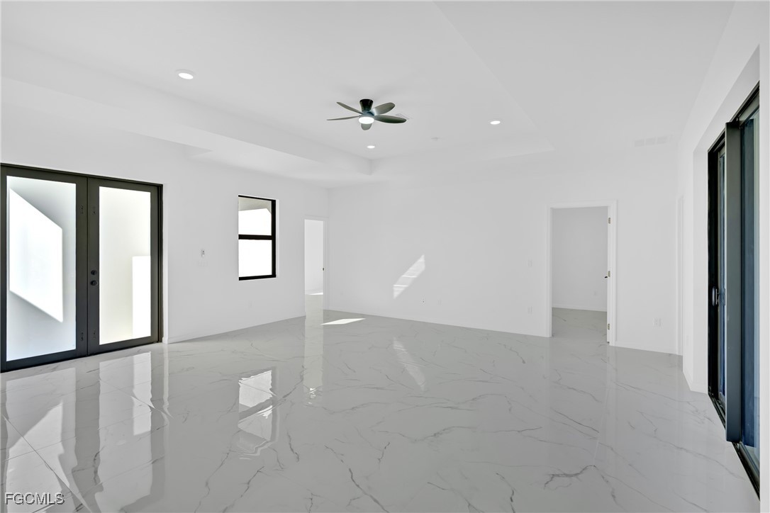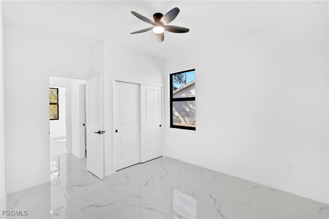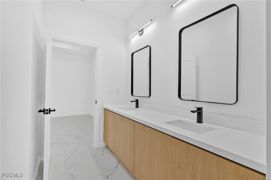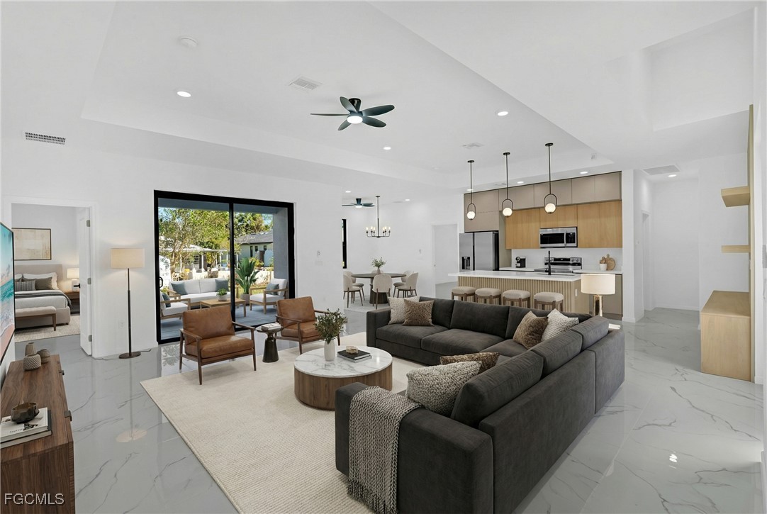 Step into modern luxury with this beautifully designed new construction home offering a bright, open-concept layout and designer finishes throughout. Sleek marble-style tile flooring, tray ceilings, and oversized windows create a clean, upscale feel from the moment you enter. The kitchen is the centerpiece, featuring a striking waterfall island, custom cabinetry, pendant lighting, and stainless steel appliances—perfect for entertaining and everyday living. The primary suite offers a spa-inspired bathroom with dual vanities, matte black fixtures, and a tiled walk-in shower. Additional bedrooms provide flexibility for guests, family, or a home office. Enjoy a spacious backyard and modern curb appeal in a growing Lehigh Acres neighborhood.