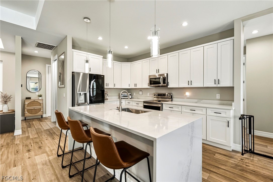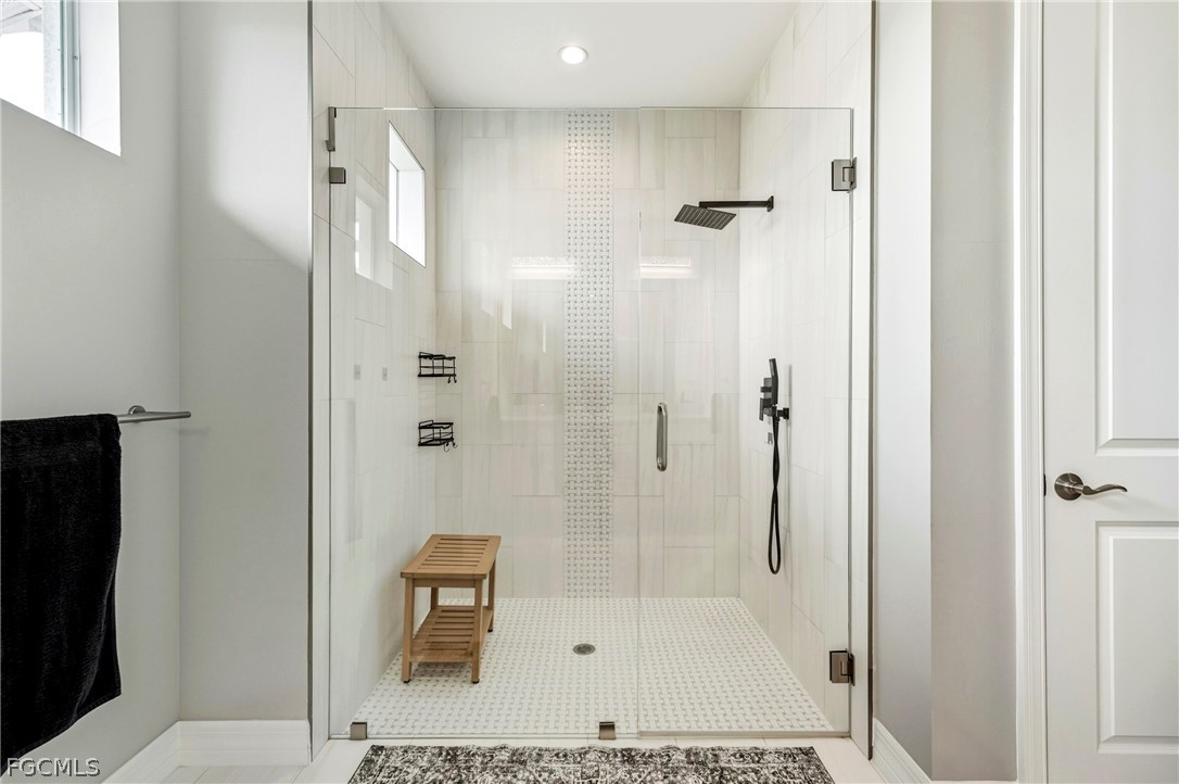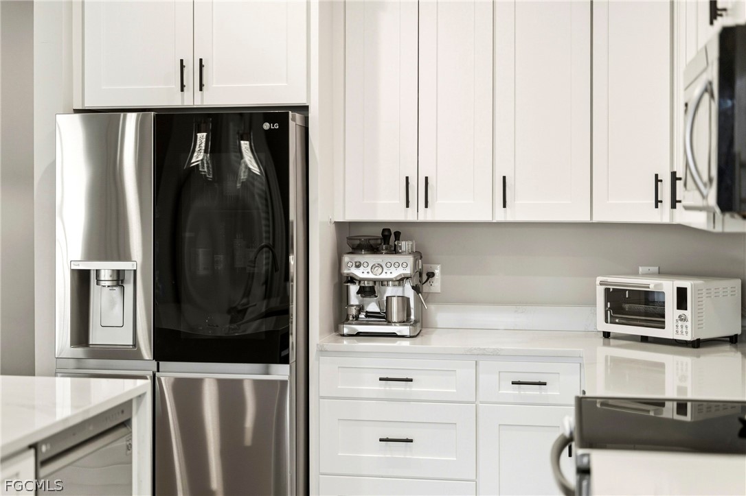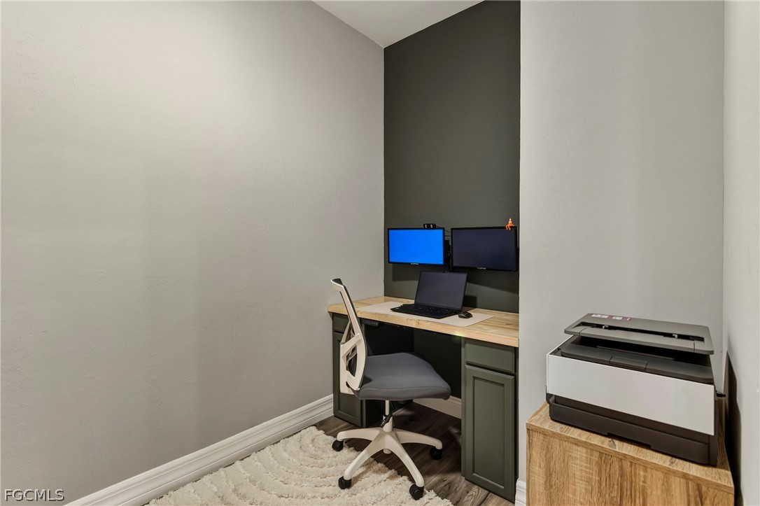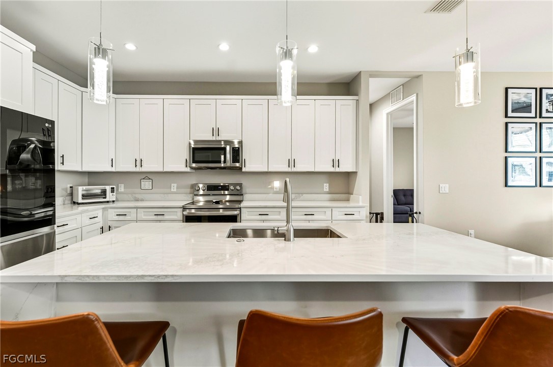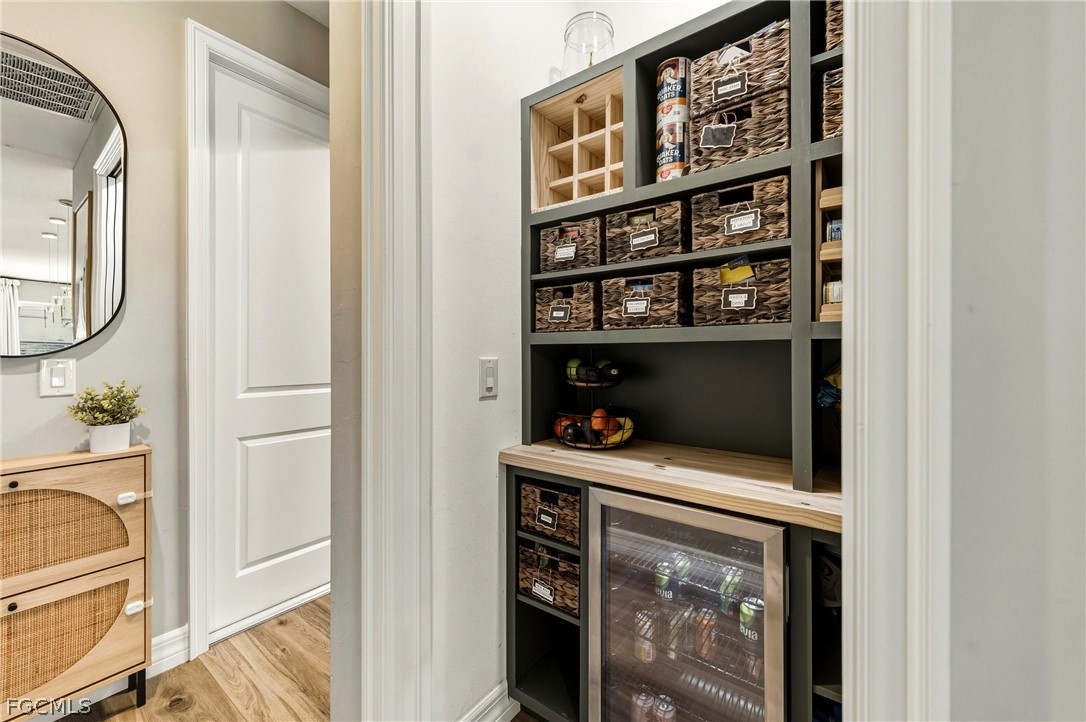 The kitchen includes quartz countertops, stainless steel appliances, soft close cabinets, upgraded lighting and fixtures, a waterfall edge island, and a large pantry with custom cabinetry and a built in mini fridge. The refrigerator is connected to a reverse osmosis water system. The den includes an adjustable height, built in desk and provides flexible space for a home office or bonus room.