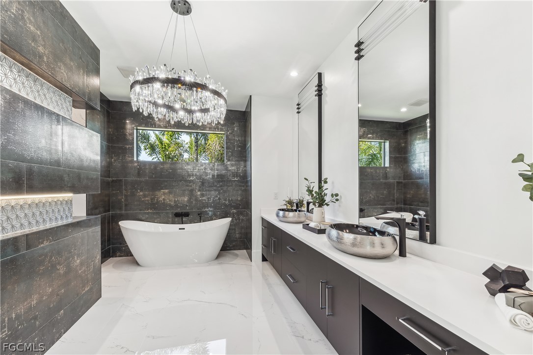 Inside, the home features a bright, open-concept floor plan with soaring ceilings, expansive impact-resistant windows, and high-end finishes throughout. The chef-inspired kitchen boasts quartz countertops, custom cabinetry, stainless steel appliances, and a spacious island ideal for entertaining. The split-bedroom layout provides privacy and comfort, while the primary suite offers a spa-like retreat with dual vanities, a walk-in shower, and generous closet space.