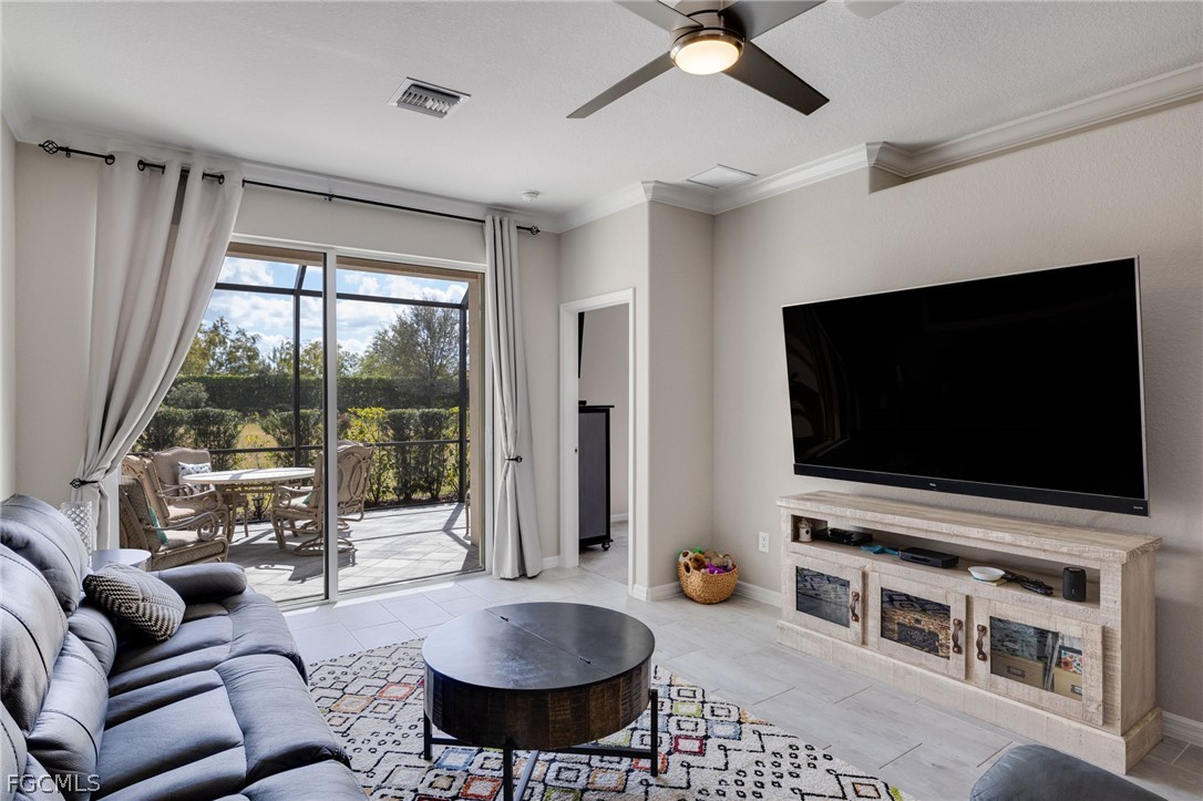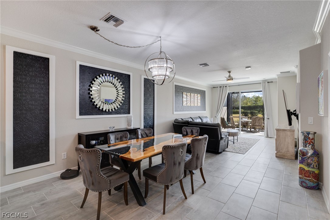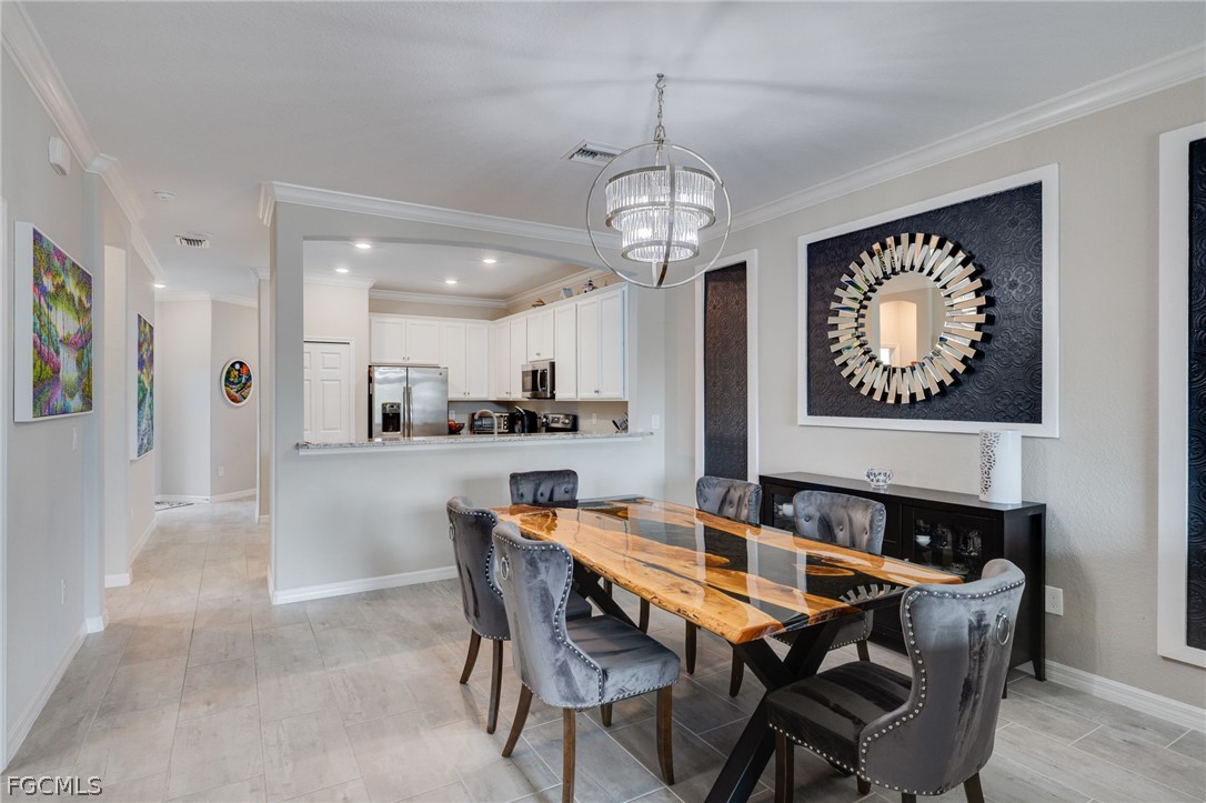 The layout feels open yet warm, with natural light filtering through wide sliders and highlighting the CUSTOM TRIM WORK & PROFESSIONAL DESIGN FINISHES that immediately set the home apart from typical builder-grade villas. Upgraded lighting and a statement dining chandelier anchor the space with subtle sophistication, creating an atmosphere that feels polished without sacrificing comfort.
