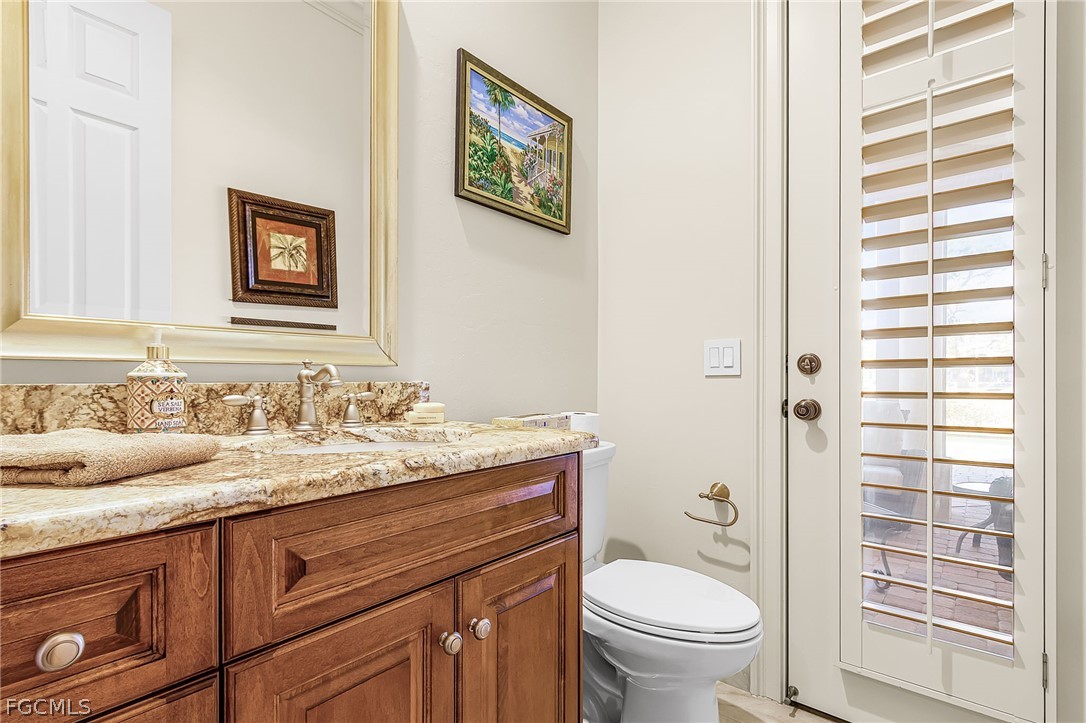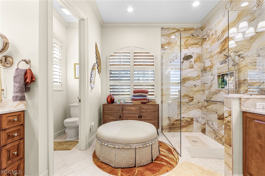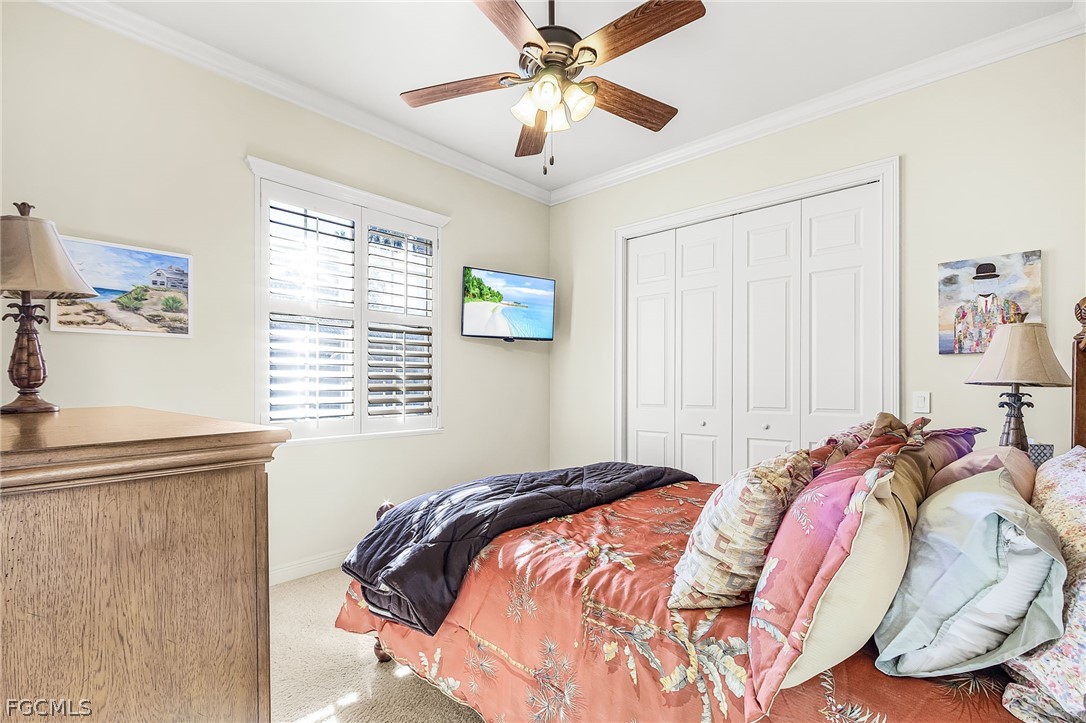 The two guest bedrooms are generously sized with plantation shutters, crown molding, ceiling fans, and ample closets. The guest bath doubles as a pool bath with direct lanai access, featuring a walk-in shower with glass enclosure, tile floor, vanity with granite, framed mirror, and plantation shutters—fresh and updated.
