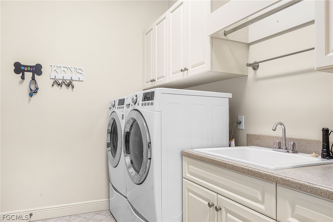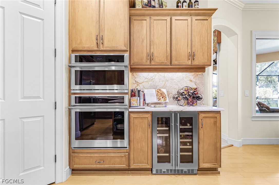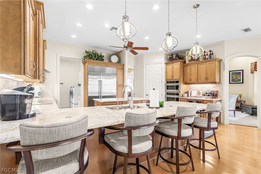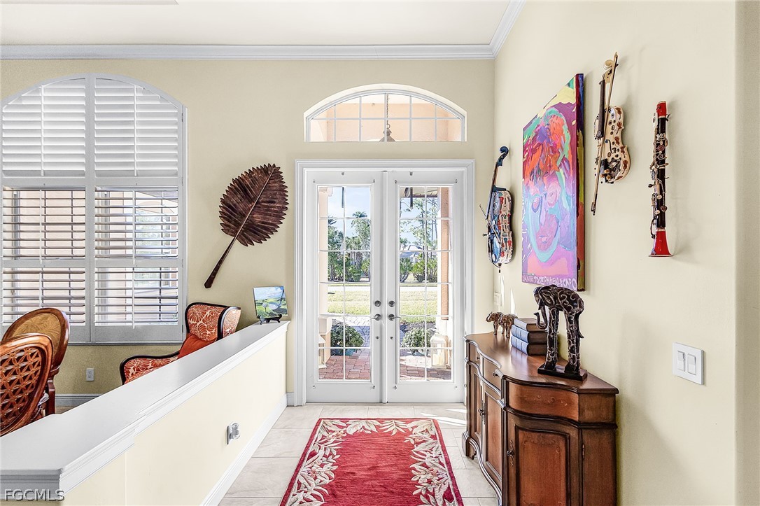 Immerse yourself in this exceptional furnished residence in prestigious Fiddlesticks Country Club, ideally positioned on the 9th fairway of the Long Mean course. Built in 2003 with a 2019 roof, this 3-bedroom + den home with 3 baths (2 full, 1 half) and 3-car garage offers stunning golf course and pool views from nearly every room. Tropical curb appeal captivates with towering mature royal palms, additional palms, and lush greenery framing the elegant Mediterranean architecture. Step through the inviting double-door entry into a grand foyer with volume ceilings, plantation shutters, and abundant natural light from the southeast exposure. The space flows into a bright, open living and dining area with tray ceilings, crown molding, arched details, and seamless connection to the family room and screened lanai. The gourmet kitchen is a showpiece at the heart of the home: high-end cabinetry, granite counters/backsplash, stainless steel appliances (induction cooktop, wall oven, microwave, vented hood, beverage/wine cooler, ice maker, warming drawer), large island with breakfast bar, walk-in pantry, reverse osmosis system, and open views to the pool and golf course. A bay-window breakfast nook adjoins the family area, filled with natural light for effortless entertaining. The spacious primary suite features wood floors, a sitting area, tray ceiling, recessed lighting, and French doors to the lanai. Plantation shutters frame the windows. The updated primary bath is spa-like with a walk-in dual-head glass shower, marble-look tiled walls, dual vanities, large mirror, and built-in shelving.