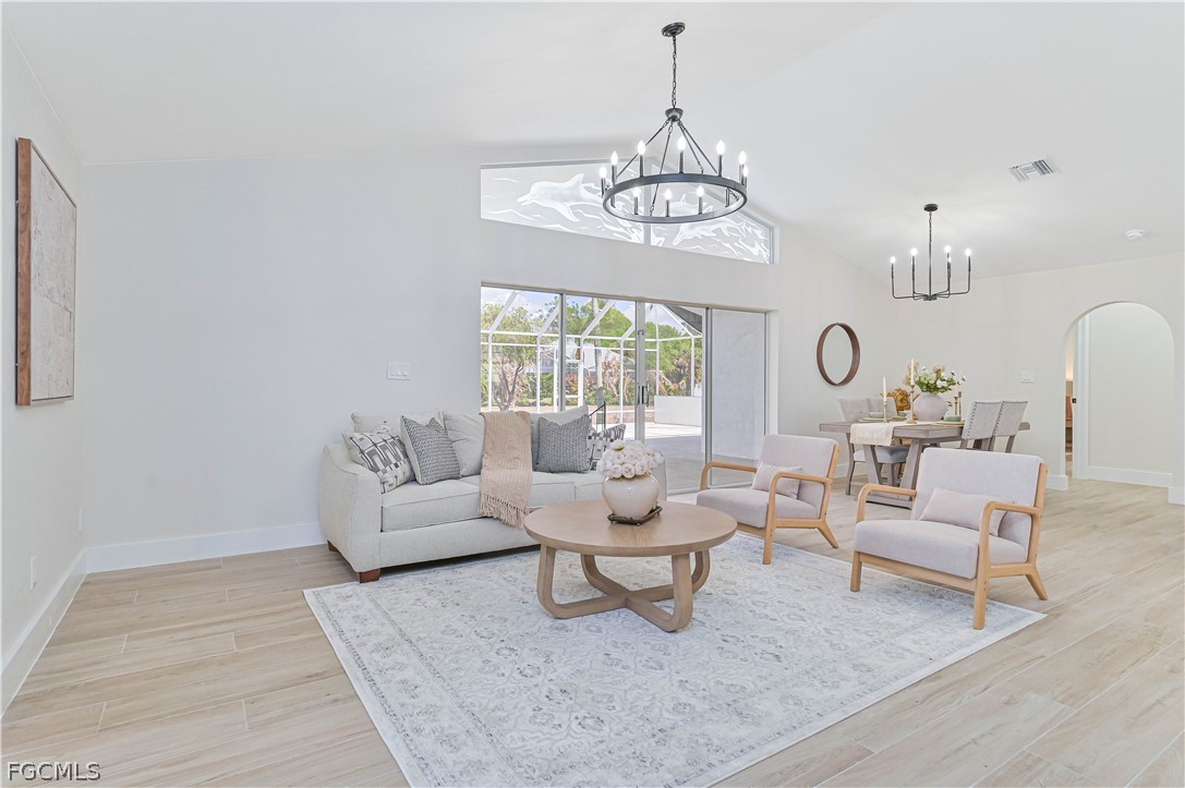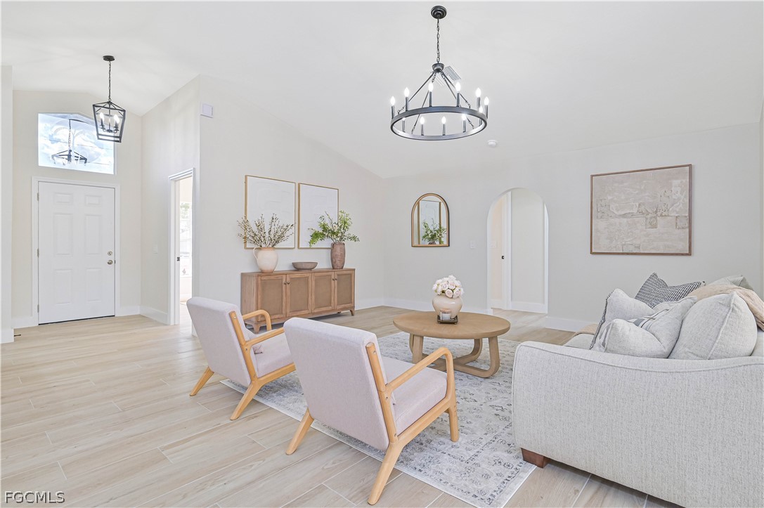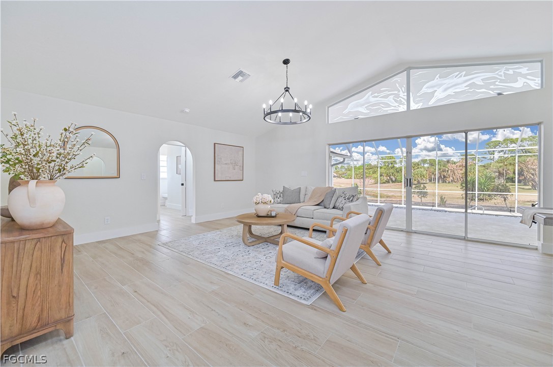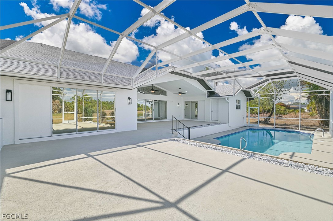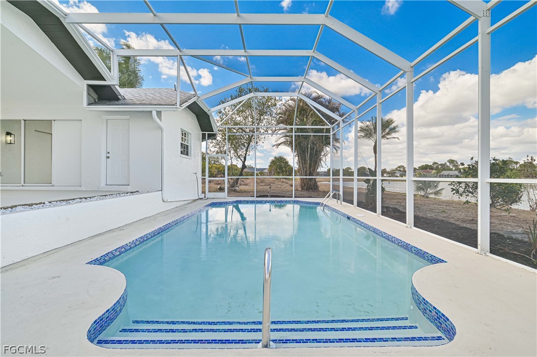 Welcome to this Stunning renovated Pool home in Lehigh Acres. Huge property with 3 bedrooms+ den, 3 bathrooms and 2 car garages. Very rare opportunity with 2 primary suites with Pool bath and one of the kind huge outdoor pool area! The property has been totally renovated from top to bottom, Step inside, you'll be greeted by stunning wood plank tile that graces the entire house with 5 inches base board gives it the modern feel. The living room, open concept with kitchen and dining area offers great practical space for family and friends gathering and partying. Nice den/office in the front of the home give it much needed separation for all the work to be done. This luxury kitchen carries brand new hardwood cabinets with soft closing features, beautiful calacatta quartz countertop with waterfall, up to the ceiling backsplash with floating shelve, not to mention 2 huge pantries just off the kitchen and brand-new stainless-steel appliances. Step inside the huge primary bedroom with vaulted ceiling and the one of the kind spas like primary bathroom literally take your breath away when you step in. The shower and tub area is the largest I have ever seen. Every bedroom is very large along with second primary tuck away that comes with the pool bathroom. Home has brand-new LED lighting throughout the entire house. Property is in X zone, so you don’t have to worry about flood insurance. Perfect screen in cage with large cover area oversees practical backyard and lake provides endless Florida outdoor living lifestyle with privacy. This is a very rare large property with 2 primary suites and pool bathroom with a huge outdoor patio area. You do not want to miss this one of the kind properties