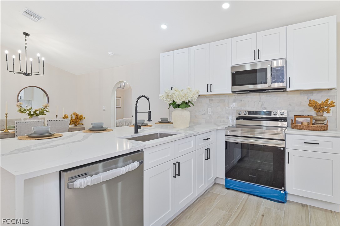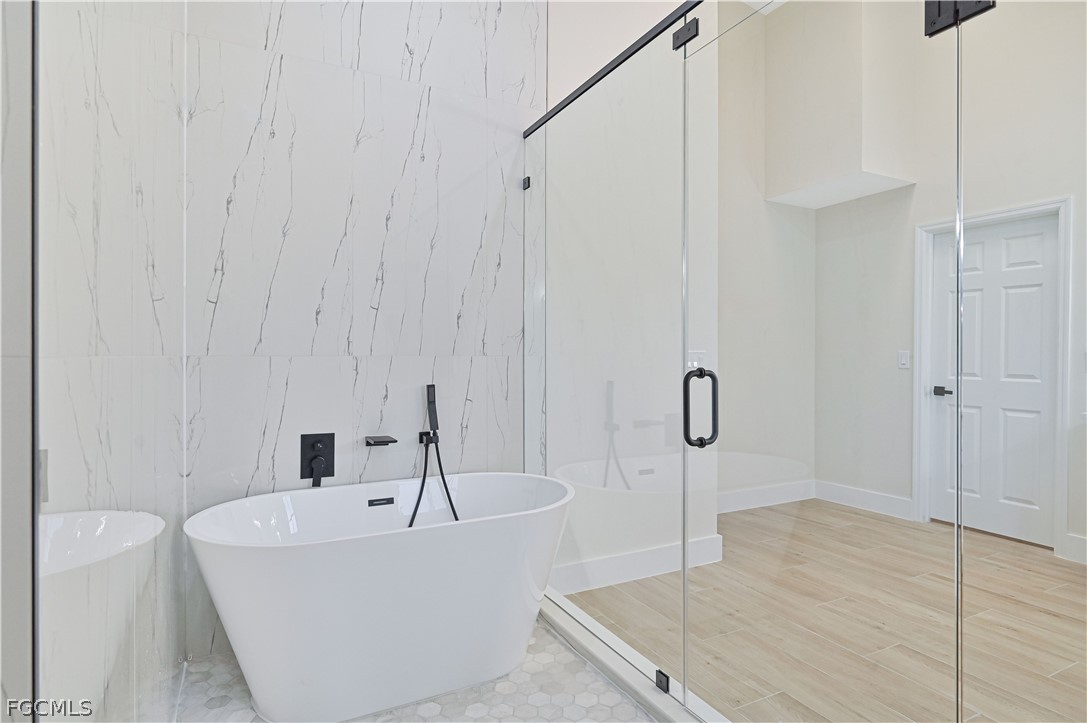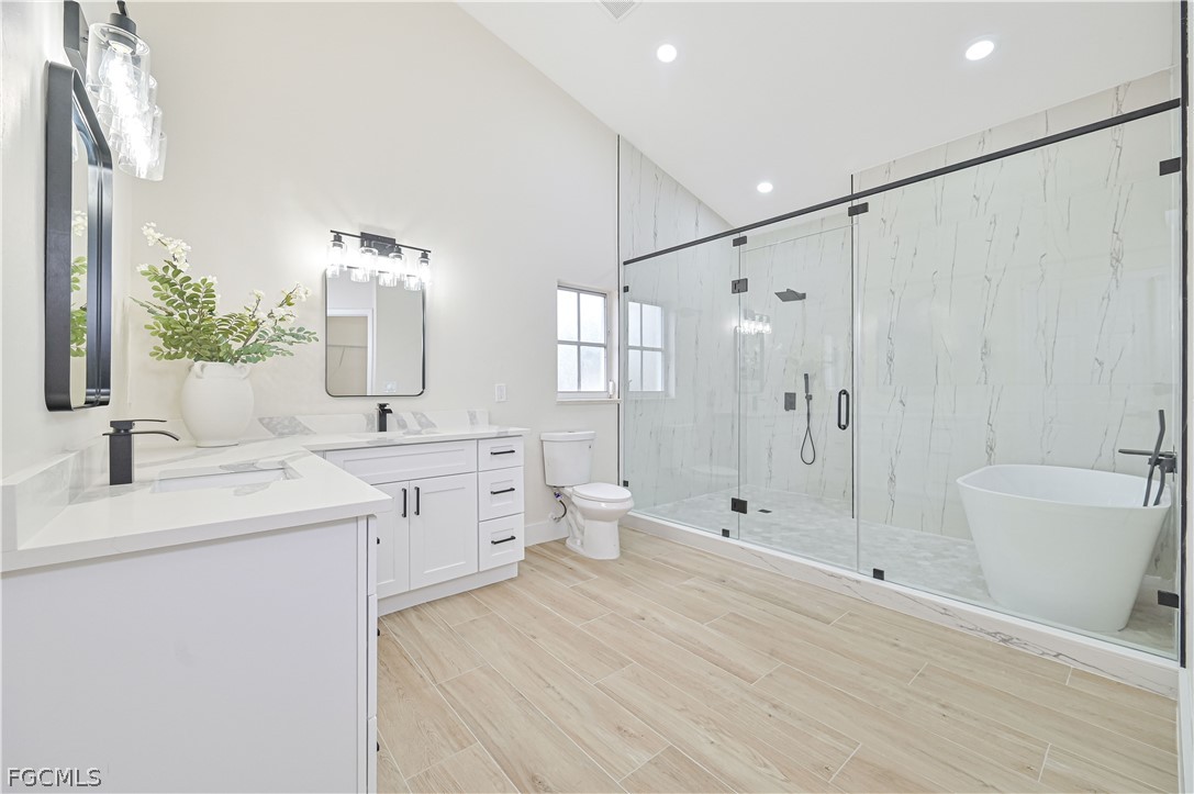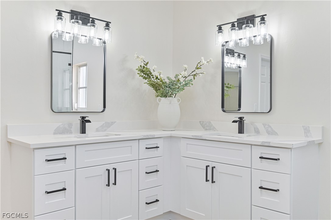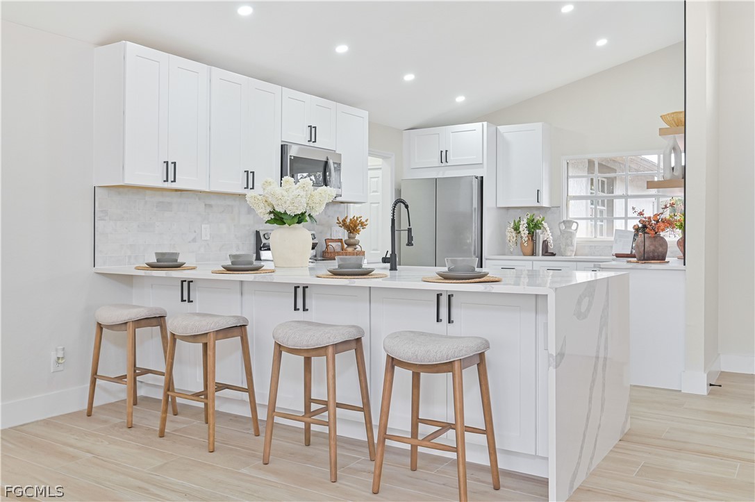 Welcome to this Stunning renovated Pool home in Lehigh Acres. Huge property with 3 bedrooms+ den, 3 bathrooms and 2 car garages. Very rare opportunity with 2 primary suites with Pool bath and one of the kind huge outdoor pool area! The property has been totally renovated from top to bottom, Step inside, you'll be greeted by stunning wood plank tile that graces the entire house with 5 inches base board gives it the modern feel. The living room, open concept with kitchen and dining area offers great practical space for family and friends gathering and partying. Nice den/office in the front of the home give it much needed separation for all the work to be done. This luxury kitchen carries brand new hardwood cabinets with soft closing features, beautiful calacatta quartz countertop with waterfall, up to the ceiling backsplash with floating shelve, not to mention 2 huge pantries just off the kitchen and brand-new stainless-steel appliances. Step inside the huge primary bedroom with vaulted ceiling and the one of the kind spas like primary bathroom literally take your breath away when you step in. The shower and tub area is the largest I have ever seen. Every bedroom is very large along with second primary tuck away that comes with the pool bathroom. Home has brand-new LED lighting throughout the entire house. Property is in X zone, so you don’t have to worry about flood insurance. Perfect screen in cage with large cover area oversees practical backyard and lake provides endless Florida outdoor living lifestyle with privacy. This is a very rare large property with 2 primary suites and pool bathroom with a huge outdoor patio area. You do not want to miss this one of the kind properties