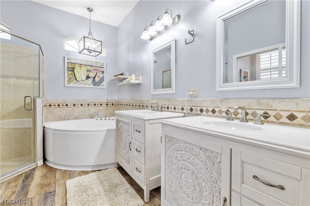 The spacious primary suite is a true retreat, complete with dual sinks, a separate walk-in shower, and a luxurious jetted soaking tub with multicolored lighting for a spa-like experience at home.