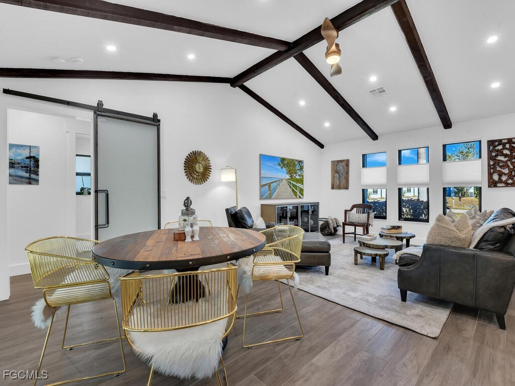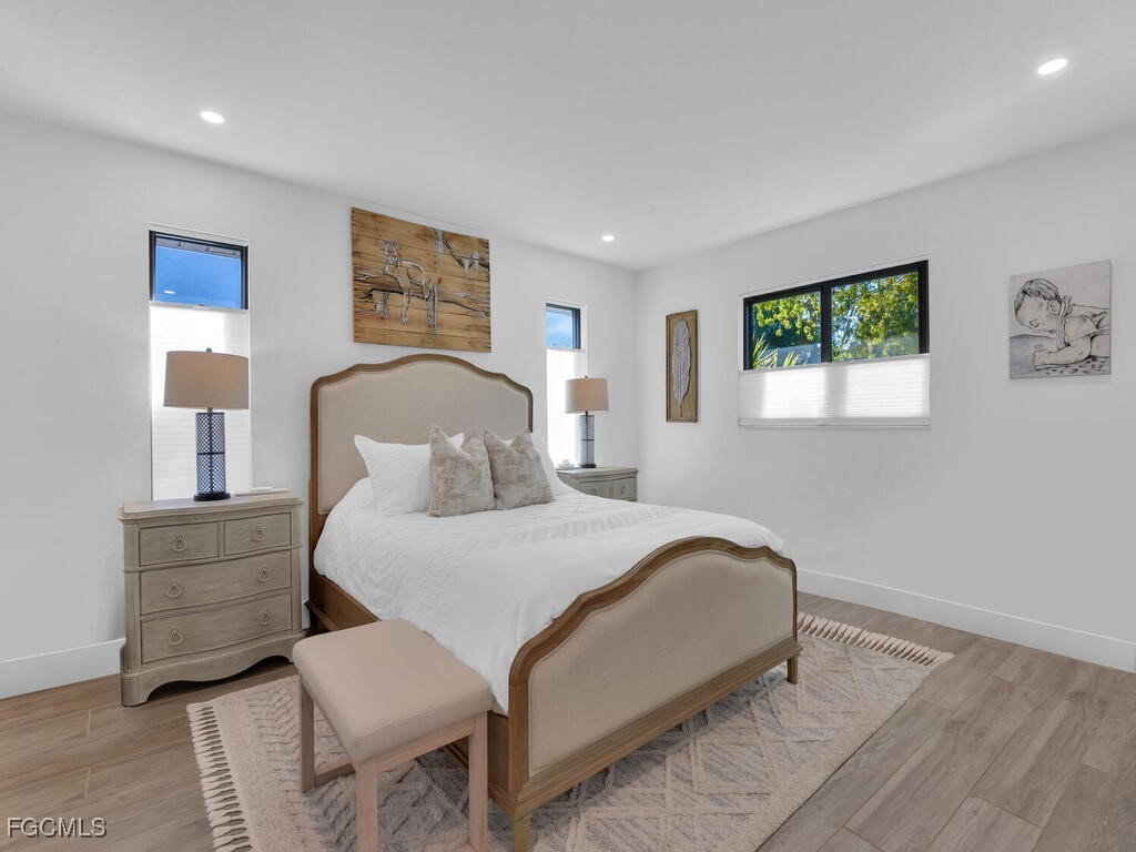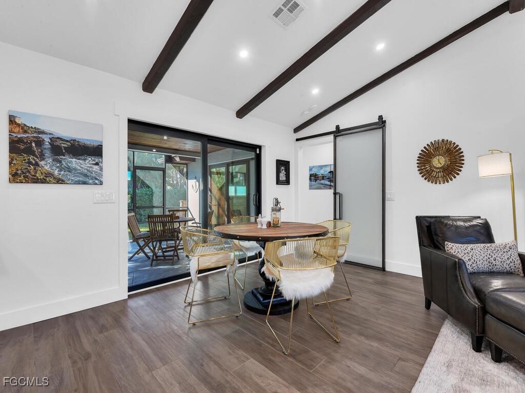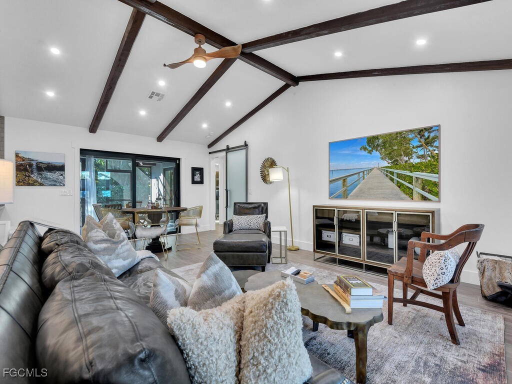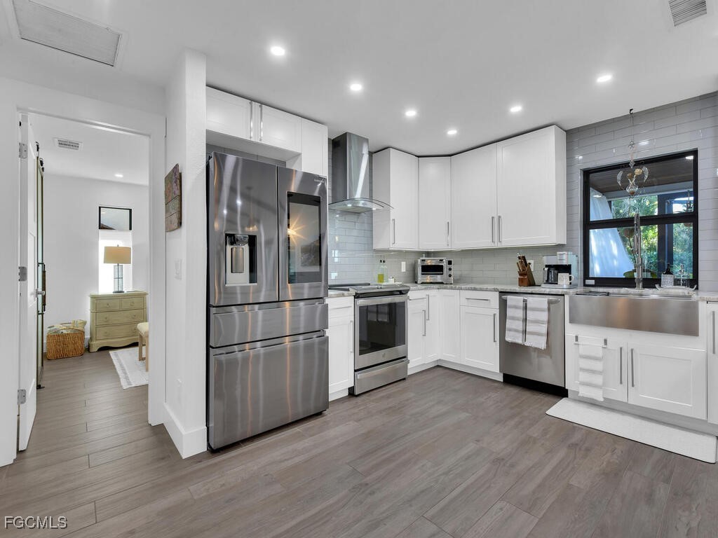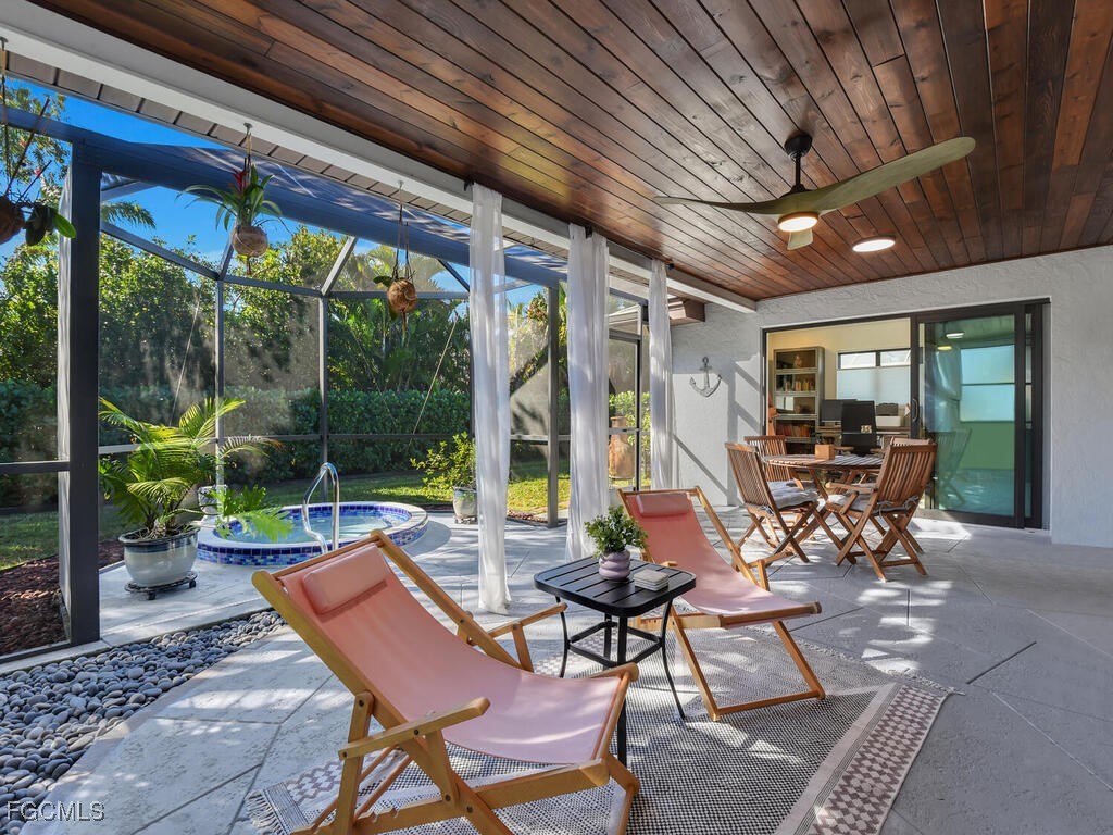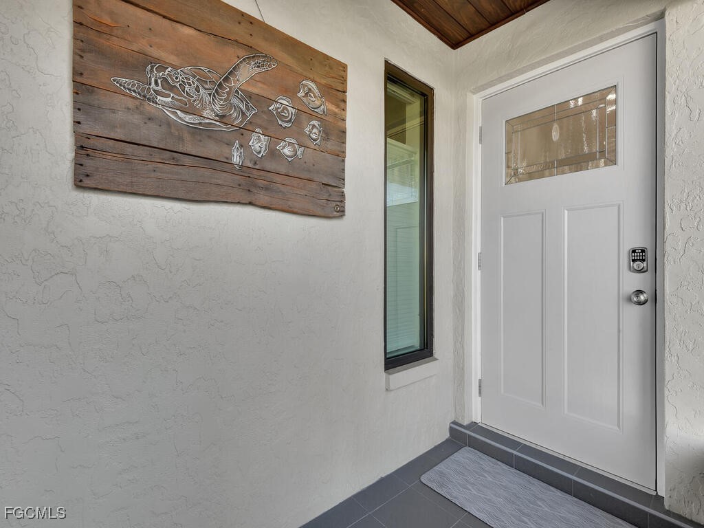 LUXURY FEATURES INSIDE & OUT! Stunning designer grade remodel w/ custom features & upgrades in every room. This is a MUST SEE renovation, its has such an amazing feel no matter what room of the home you are in. The upgrades include (but not limited to)- EcoSmart tankless hot water, upgraded electric panel (totally replaced in '19) in 2025; gorgeous wood ceilings on lanai & breezeway, high-end custom closet systems throughout, and new oven in 2024; freshly painted interior, quartz aggregate (epoxy) floor in extended garage w/ workbench, impact resistant hurricane grade windows, insulated garage door/motor/springs, beautiful front door, solid core doors on entryways & closets, 2 custom glass barn-style sliding doors, tile flooring in 2023; roof replaced, new washer/dryer/fridge in 2022; and new garage cabinets in 2019. Inside the home you will find a wonderful open concept living design, cathedral ceiling w/ beams in great room, designer doors/trim/baseboards, gourmet kitchen layout (w/ waterfall side on countertop, designer cabinetry, stainless steel appliances, glass subway tile backsplash, high-end hardware, & breakfast bar), split bedroom floor plan, laundry room w/ cabinetry, screened front entry, custom high-end window treatments throughout, spacious screened rear lanai w/ long covered area, heated spa, and updated tropical landscaping surrounding the entire home. HIGHLY DESIRED area of Cape Coral. You will be within a short distance from lots of shopping/dining options, easy access to bridge to Fort Myers, quick drive to Yacht Club, Cape Coral Downtown, Cape Harbour, & Tarpon Point. Plus, the BRAND NEW Slipaway Food Truck Park & Marina is right down the road and gives you a great boating atmosphere w/ waterfront dining.
