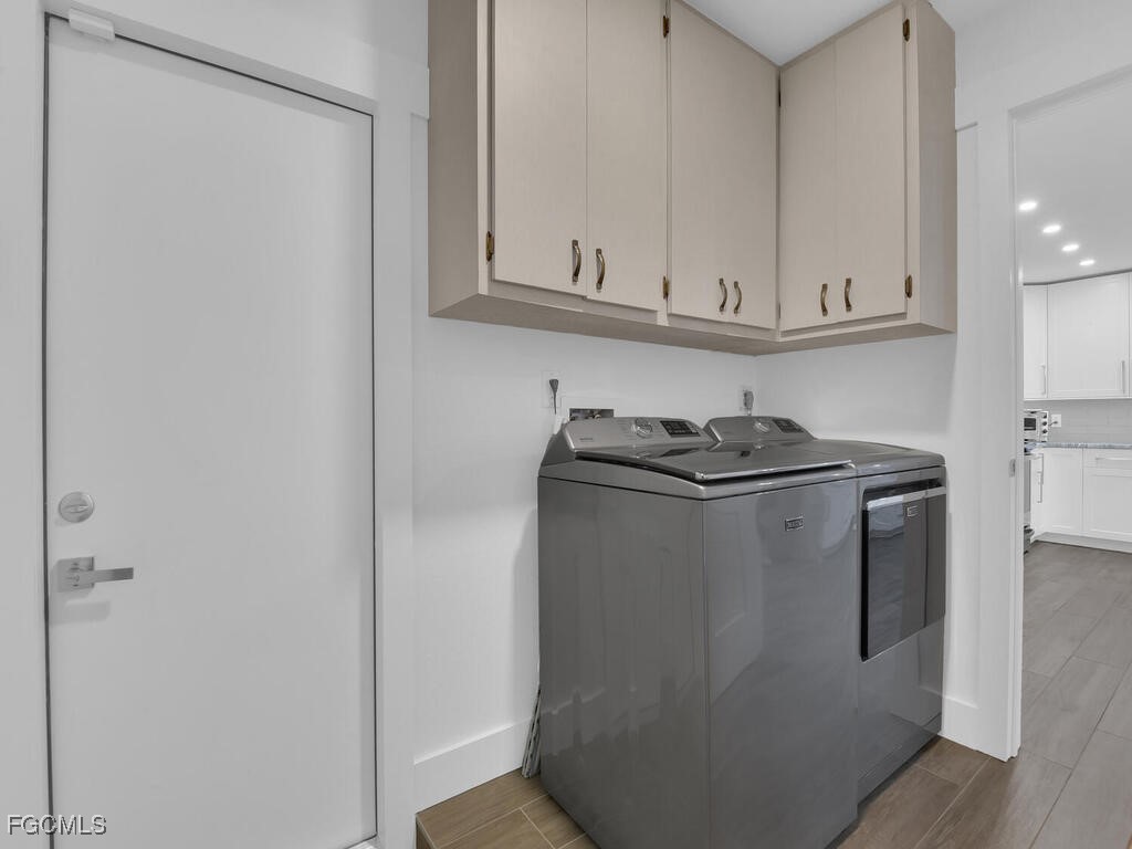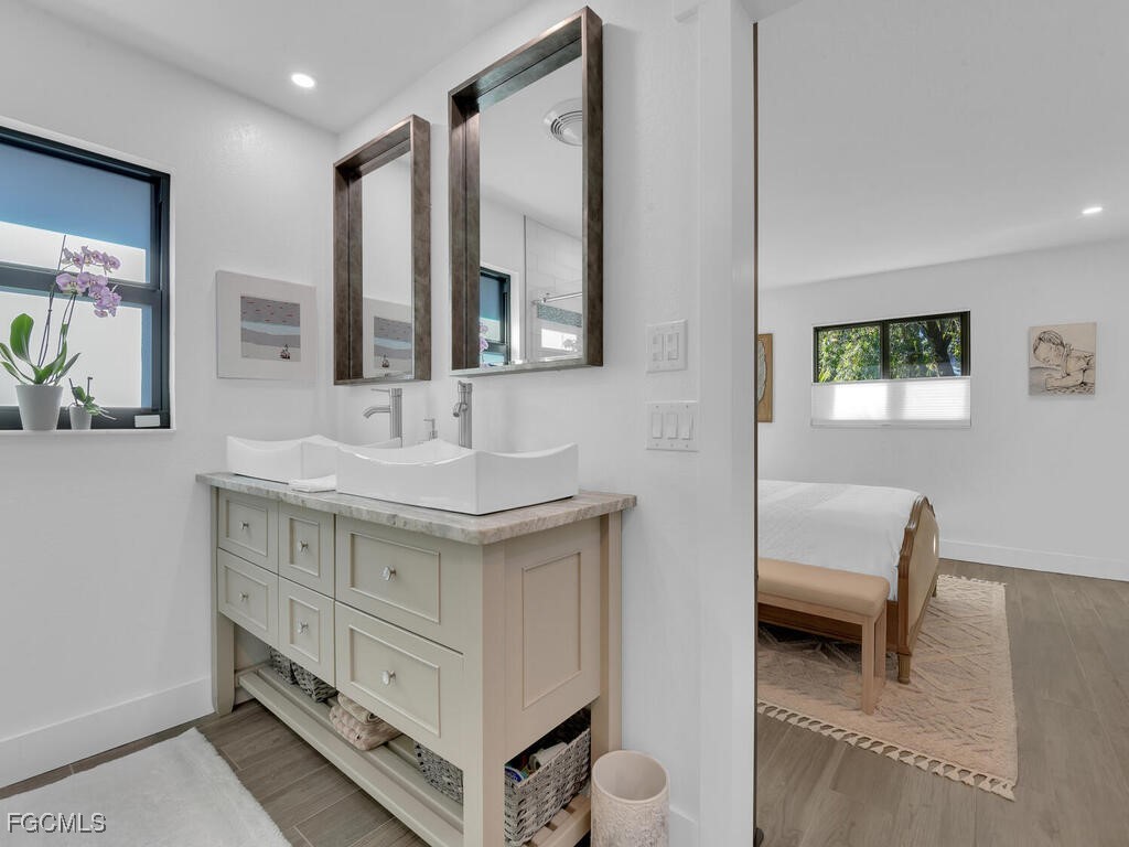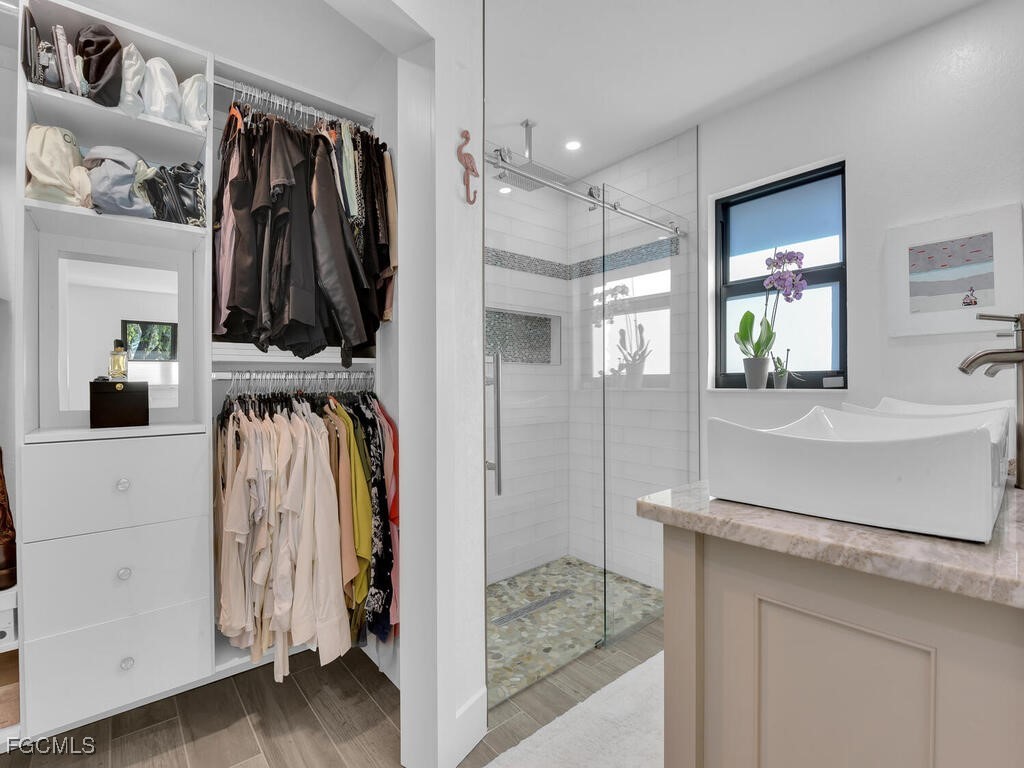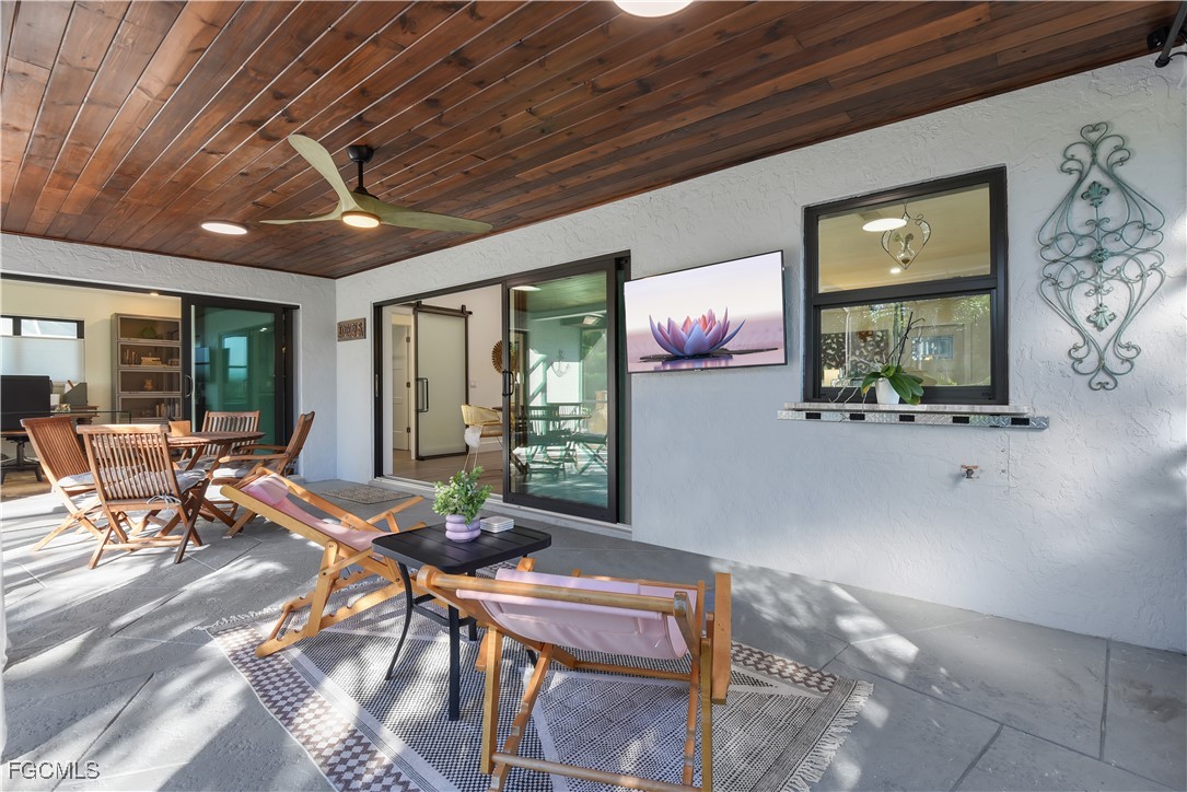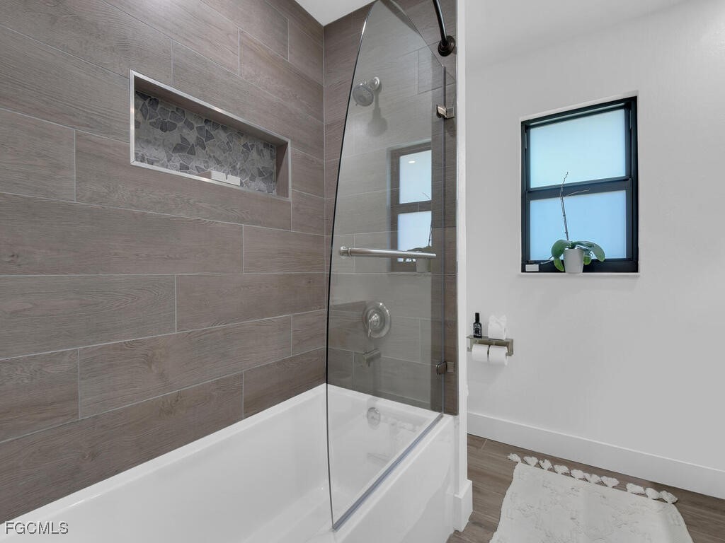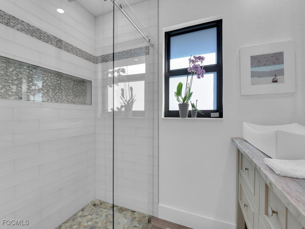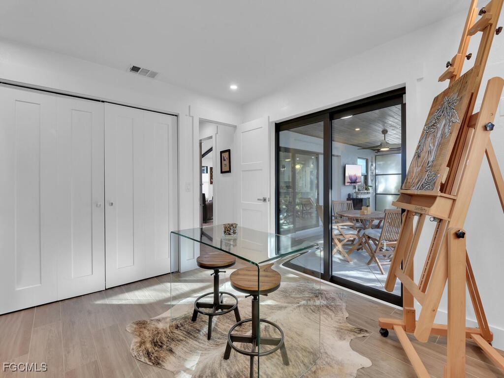 LUXURY FEATURES INSIDE & OUT! Stunning designer grade remodel w/ custom features & upgrades in every room. This is a MUST SEE renovation, its has such an amazing feel no matter what room of the home you are in. The upgrades include (but not limited to)- EcoSmart tankless hot water, upgraded electric panel (totally replaced in '19) in 2025; gorgeous wood ceilings on lanai & breezeway, high-end custom closet systems throughout, and new oven in 2024; freshly painted interior, quartz aggregate (epoxy) floor in extended garage w/ workbench, impact resistant hurricane grade windows, insulated garage door/motor/springs, beautiful front door, solid core doors on entryways & closets, 2 custom glass barn-style sliding doors, tile flooring in 2023; roof replaced, new washer/dryer/fridge in 2022; and new garage cabinets in 2019. Inside the home you will find a wonderful open concept living design, cathedral ceiling w/ beams in great room, designer doors/trim/baseboards, gourmet kitchen layout (w/ waterfall side on countertop, designer cabinetry, stainless steel appliances, glass subway tile backsplash, high-end hardware, & breakfast bar), split bedroom floor plan, laundry room w/ cabinetry, screened front entry, custom high-end window treatments throughout, spacious screened rear lanai w/ long covered area, heated spa, and updated tropical landscaping surrounding the entire home. HIGHLY DESIRED area of Cape Coral. You will be within a short distance from lots of shopping/dining options, easy access to bridge to Fort Myers, quick drive to Yacht Club, Cape Coral Downtown, Cape Harbour, & Tarpon Point. Plus, the BRAND NEW Slipaway Food Truck Park & Marina is right down the road and gives you a great boating atmosphere w/ waterfront dining.