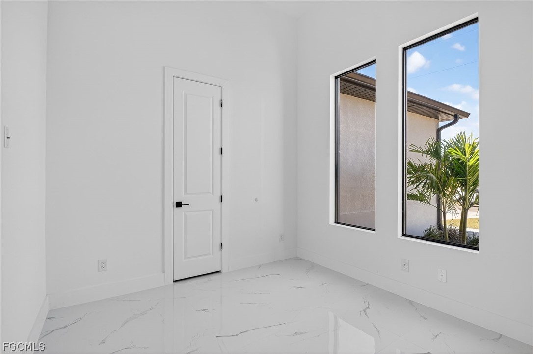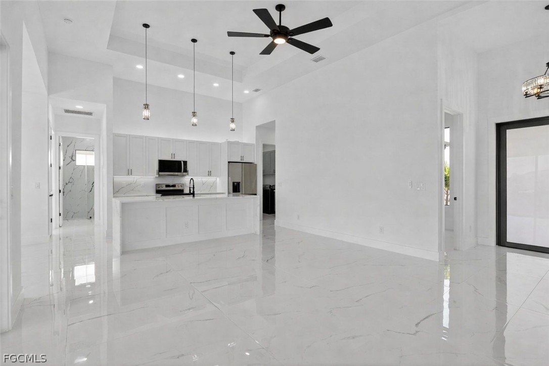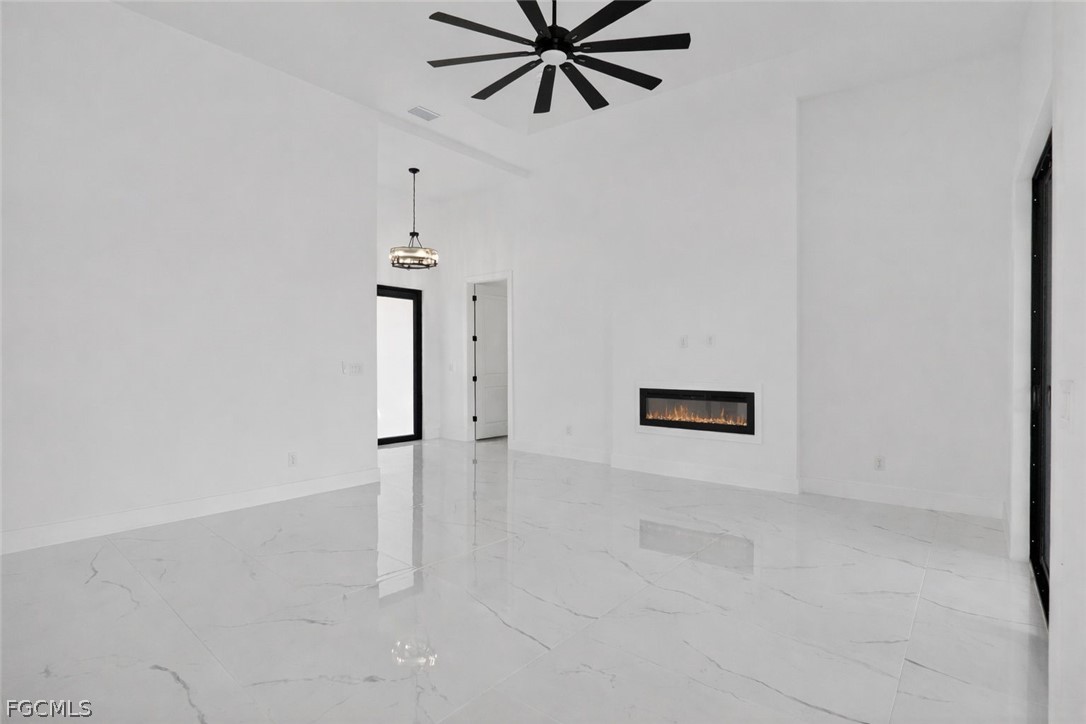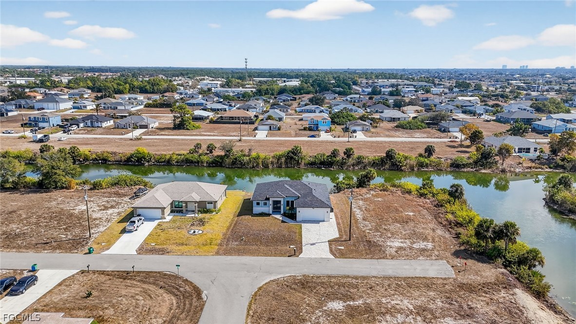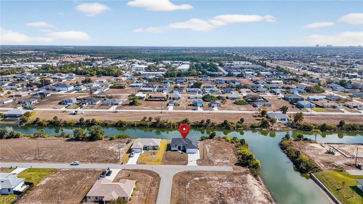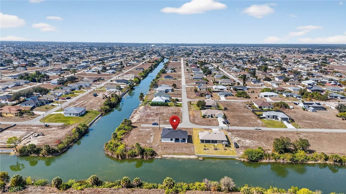 Brand New Construction home on Freshwater Canal. 3-bedrooms + den, 2 baths, 2 car garage. With a window and closet, the den can easily function as a fourth bedroom, home office, or guest room. NOT IN A FLOOD ZONE. The open floor plan features a modern kitchen with quartz countertops and waterfall island, 42" cabinets, sleek finishes, high ceilings, and large 24' x 48' marble mosaic tile throughout. Enjoy modern light fixtures and fans in every room. Step outside to your lanai and backyard overlooking the peaceful freshwater canal. The primary bedroom and living room offer direct access to the outdoor kitchen with a grill, granite countertop, a full size sink and small refrigerator. The 2 recessed wall mounted fireplaces create a cozy ambiance (one in the living room and the other in the primary bedroom). Epoxy floors in the garage and front porch. Includes washer, dryer and a laundry tub.