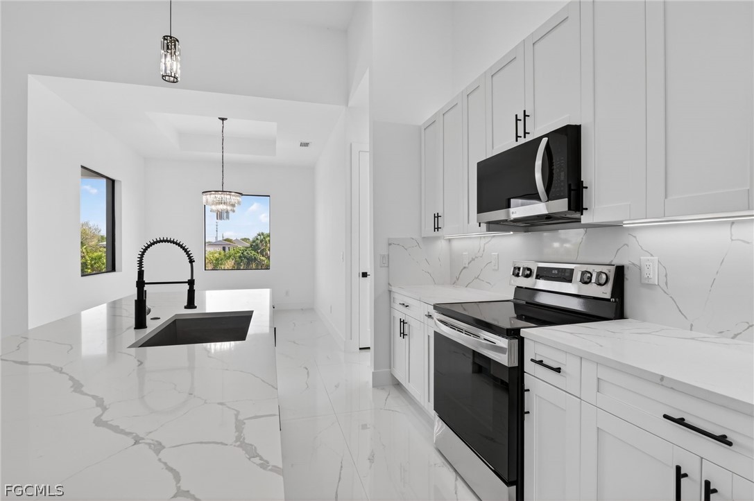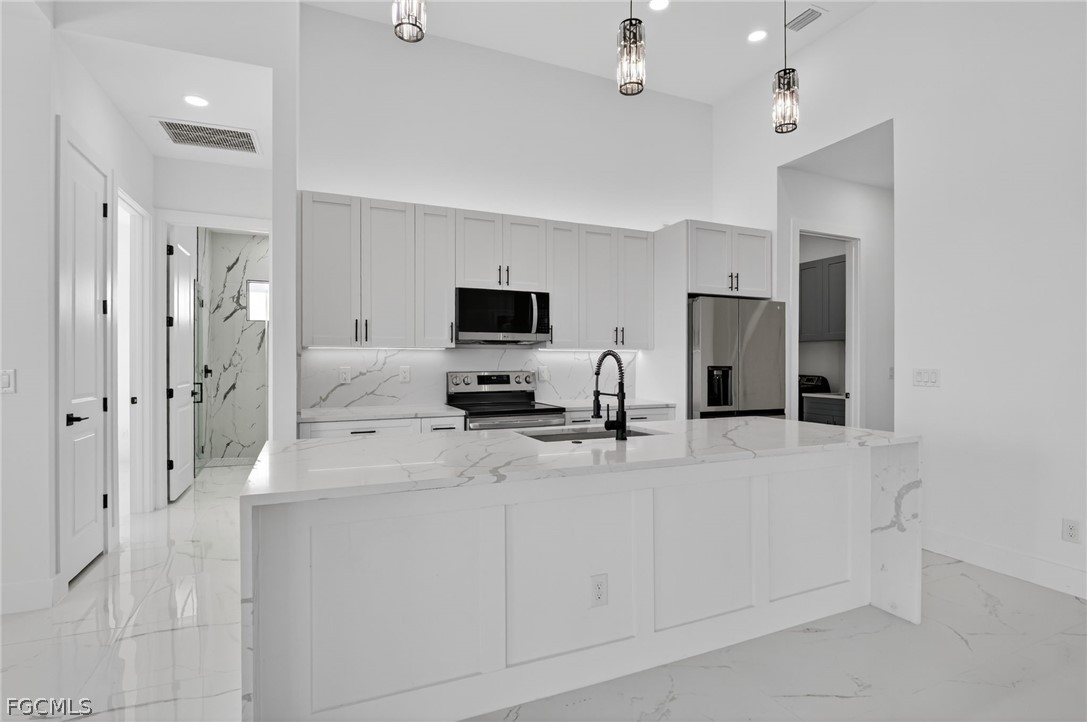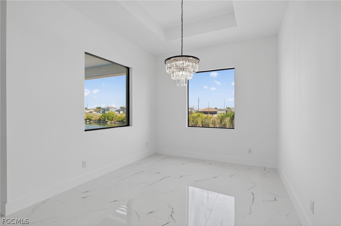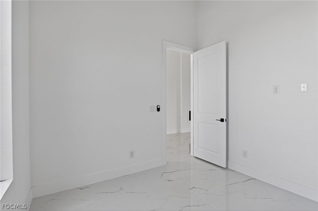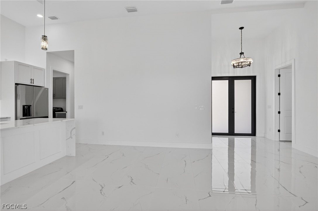 Brand New Construction home on Freshwater Canal. 3-bedrooms + den, 2 baths, 2 car garage. With a window and closet, the den can easily function as a fourth bedroom, home office, or guest room. NOT IN A FLOOD ZONE. The open floor plan features a modern kitchen with quartz countertops and waterfall island, 42" cabinets, sleek finishes, high ceilings, and large 24' x 48' marble mosaic tile throughout. Enjoy modern light fixtures and fans in every room. Step outside to your lanai and backyard overlooking the peaceful freshwater canal. The primary bedroom and living room offer direct access to the outdoor kitchen with a grill, granite countertop, a full size sink and small refrigerator. The 2 recessed wall mounted fireplaces create a cozy ambiance (one in the living room and the other in the primary bedroom). Epoxy floors in the garage and front porch. Includes washer, dryer and a laundry tub.