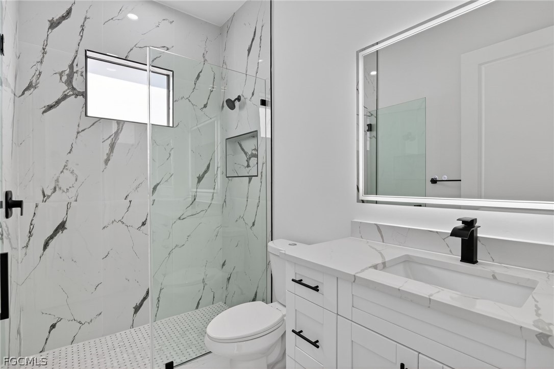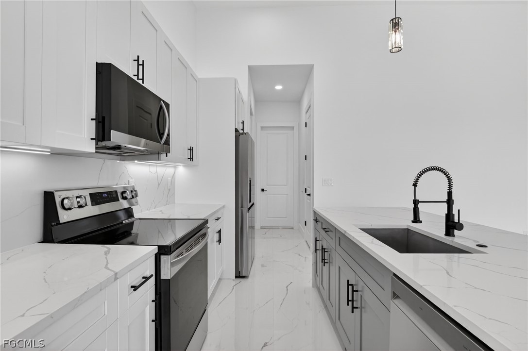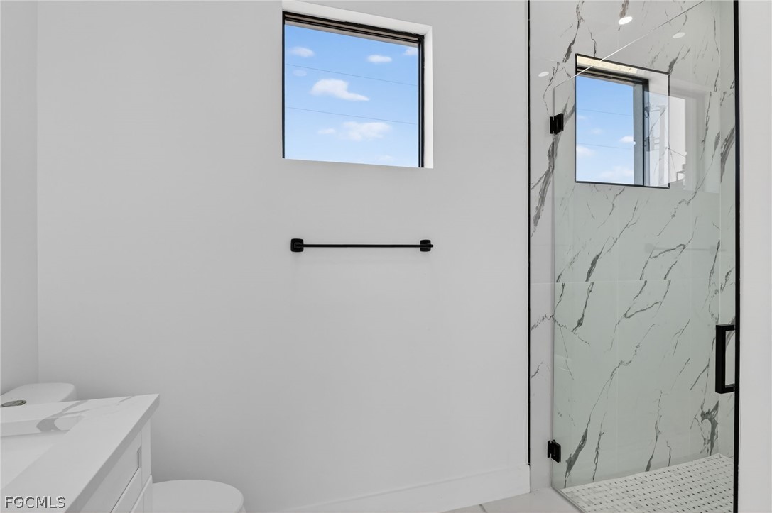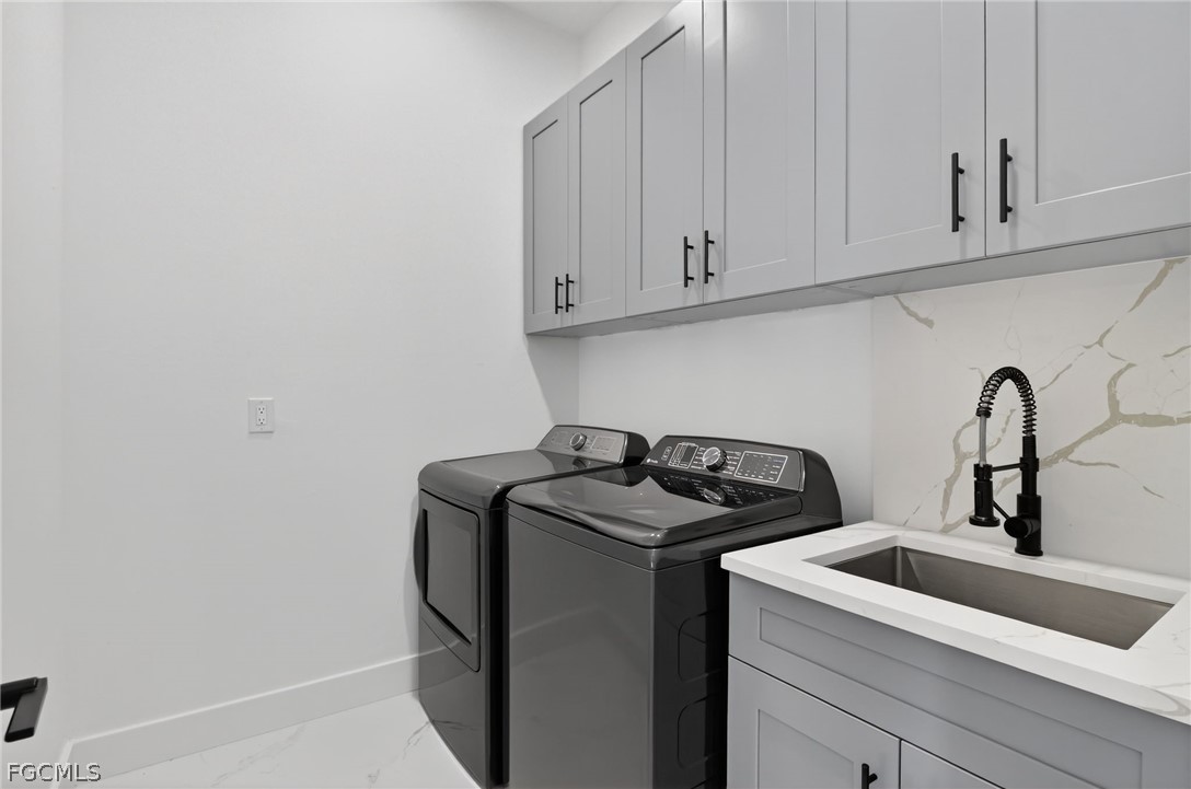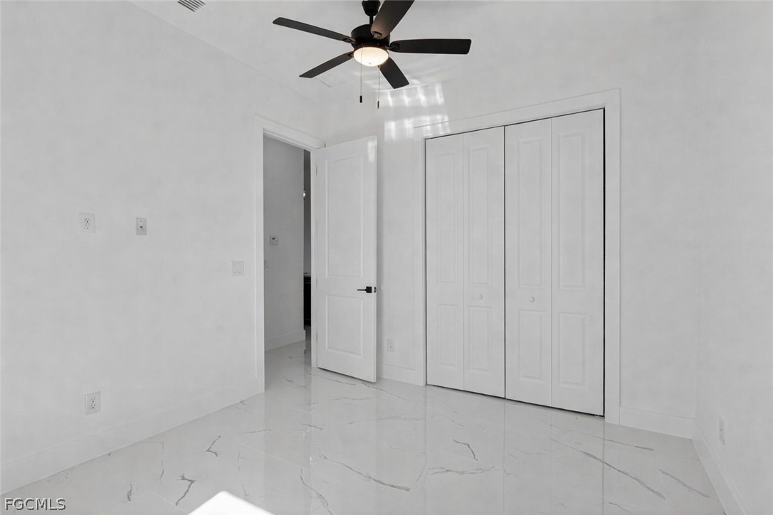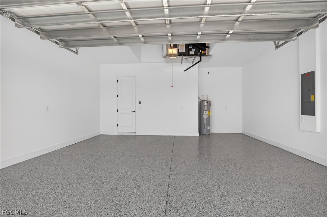 Brand New Construction home on Freshwater Canal. 3-bedrooms + den, 2 baths, 2 car garage. With a window and closet, the den can easily function as a fourth bedroom, home office, or guest room. NOT IN A FLOOD ZONE. The open floor plan features a modern kitchen with quartz countertops and waterfall island, 42" cabinets, sleek finishes, high ceilings, and large 24' x 48' marble mosaic tile throughout. Enjoy modern light fixtures and fans in every room. Step outside to your lanai and backyard overlooking the peaceful freshwater canal. The primary bedroom and living room offer direct access to the outdoor kitchen with a grill, granite countertop, a full size sink and small refrigerator. The 2 recessed wall mounted fireplaces create a cozy ambiance (one in the living room and the other in the primary bedroom). Epoxy floors in the garage and front porch. Includes washer, dryer and a laundry tub.