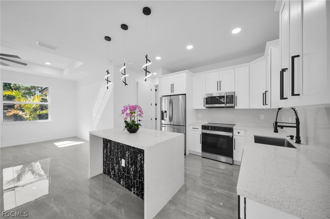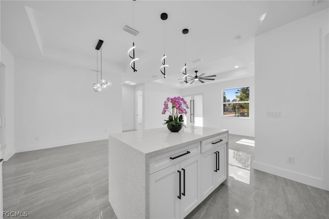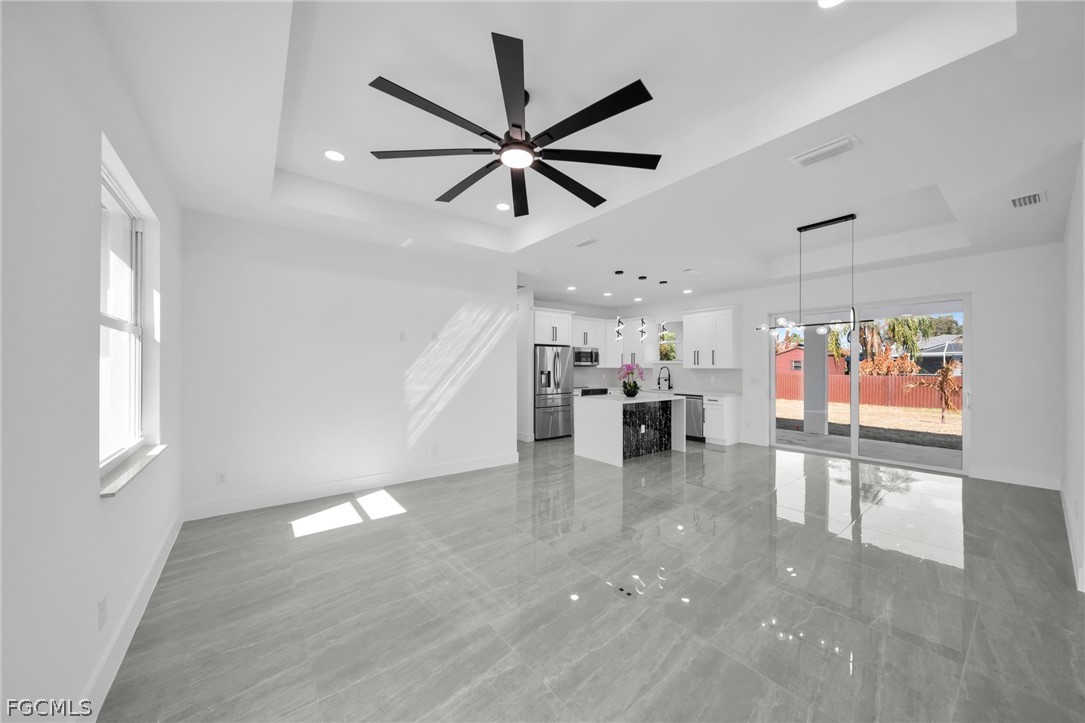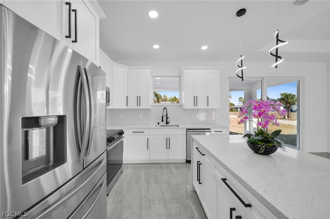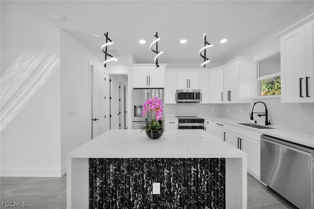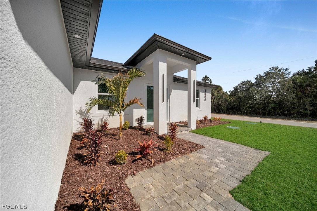 Brand-new construction offering 1,387 sq ft under air with a thoughtfully designed 3-bedroom, 2-bath floor plan conveniently located for a future pool. This modern home features an open-concept layout with high ceilings, oversized tile flooring throughout, and abundant natural light. The contemporary kitchen boasts quartz countertops, custom cabinetry with designer hardware, stainless steel appliances, and a spacious island ideal for entertaining. Impact windows and doors, sleek lighting fixtures, and quality finishes elevate the home’s modern aesthetic. The primary suite offers a spa-inspired bathroom with a glass-enclosed shower and stylish finishes. Enjoy a covered lanai overlooking a large backyard with plenty of room to add a pool. No HOA, no CDD, and located in a growing area with new construction surrounding—perfect for a primary residence or investment opportunity.