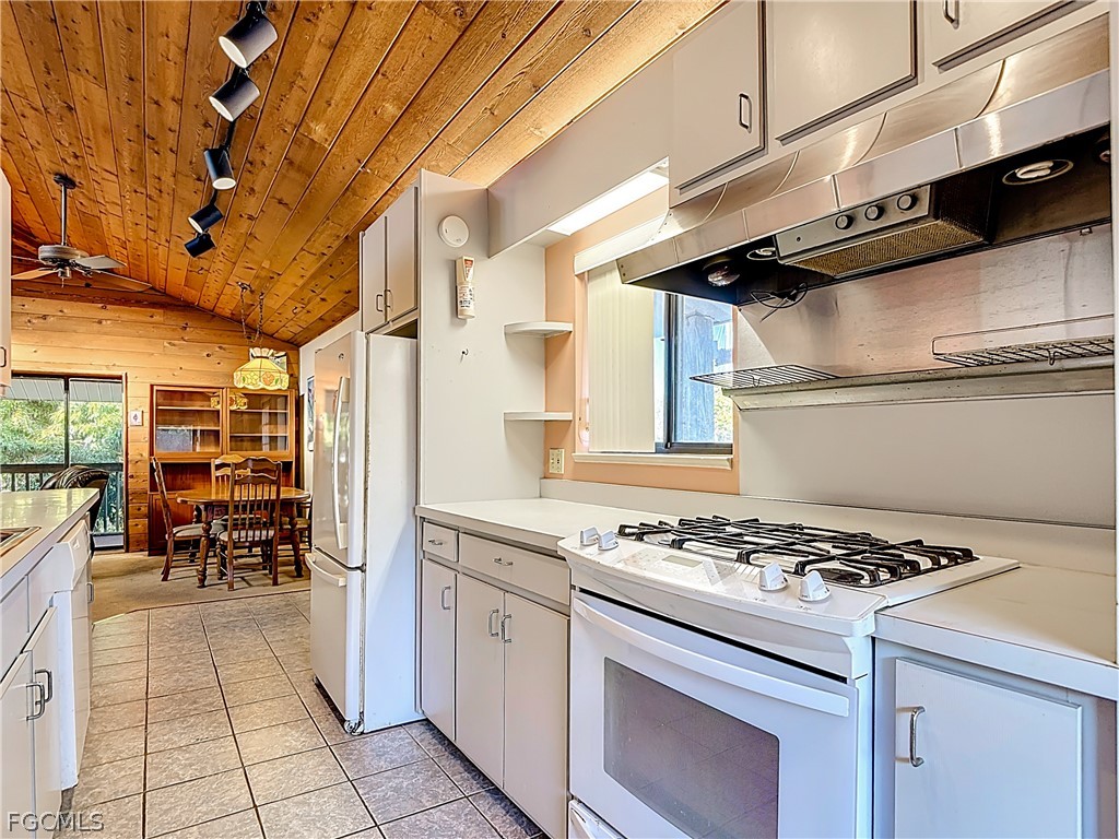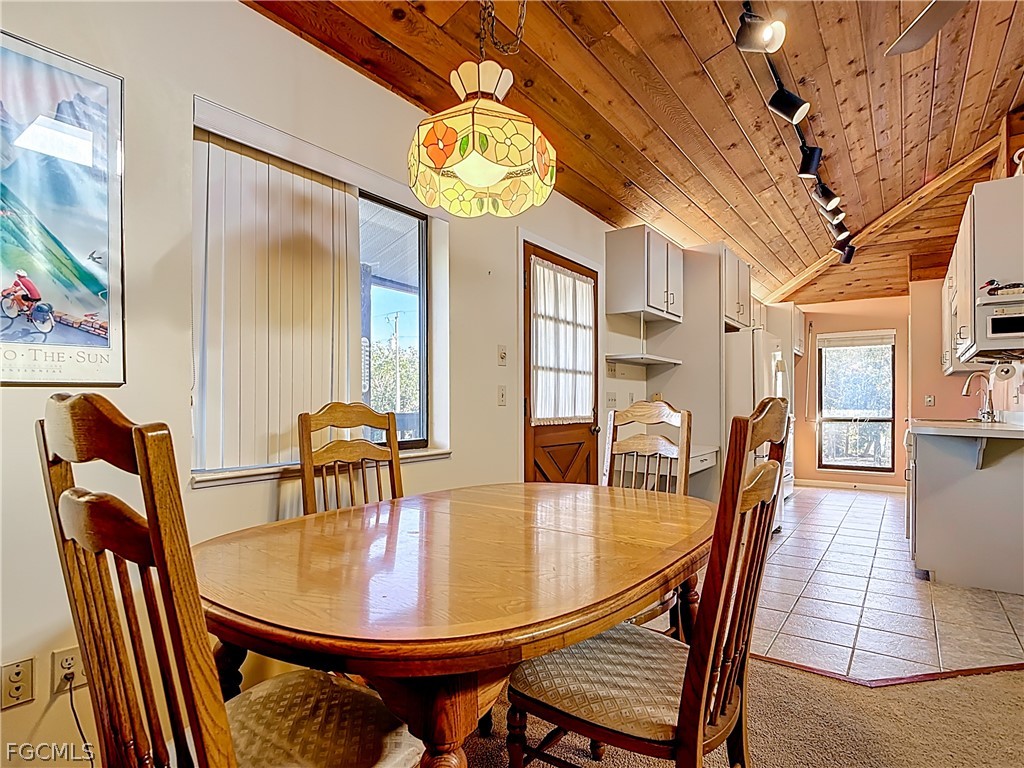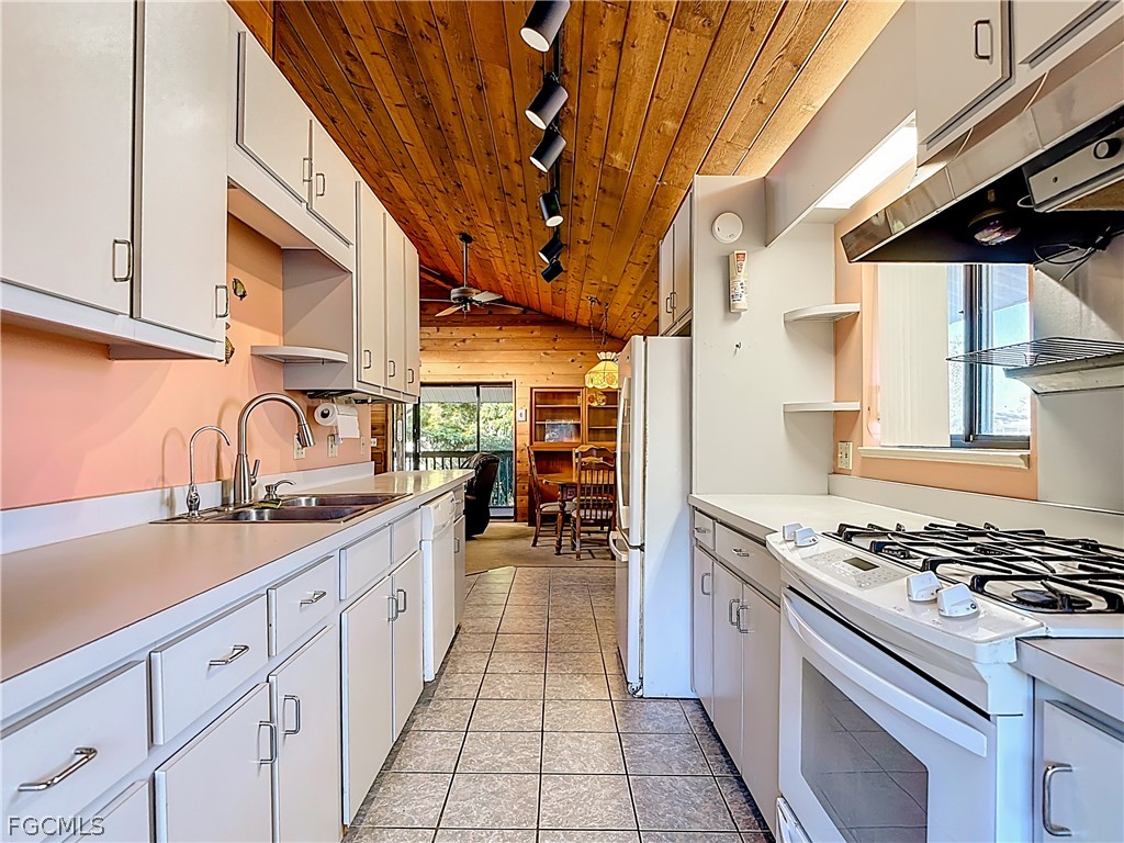 The heart of the home is the dramatic living area, highlighted by a rustic tongue-and-groove vaulted wood ceiling, a cozy Franklin stove, and expansive sliding glass doors that open to a second-living-room-sized screened porch—perfect for relaxing while taking in tranquil canal and waterfront views.