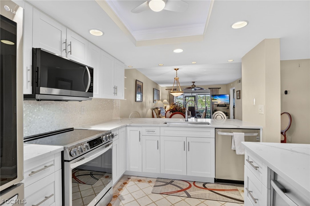 This totally remodeled unit is one to see! It boasts fully updated baths, custom closets and storm protection. The kitchen features an open concept design, a spacious island, high-end stainless-steel appliances, and quartz countertops. The lanai looks out at the 16th fairway and 17th tee box. The roof was replaced in 2024 and the building was painted in 2025. and Manor I has flood insurance! The pool, tennis/pickleball court, practice and driving ranges, main tennis courts and club house are all within walking distance. Kelly Greens Golf and Country Club's prime location offers easy access to Sanibel Island, Fort Myers, and Bunche Beaches, making it a highly desirable place to live. Kelly Greens boasts a championship golf course, Har-Tru tennis courts, a fully remodeled clubhouse and a new fitness center. The dedicated and knowledgeable staff, including management, administrative, pro shop, accounting, restaurant, cart barn, and maintenance teams, are always ready to assist members, guests, and tenants. Don't miss the opportunity to own this exceptional home in a premier location, offering a luxurious lifestyle and peace of mind. Schedule your visit to 12191 Kelly Sands Way Unit #1504 today and discover all that this remarkable property has to offer.
