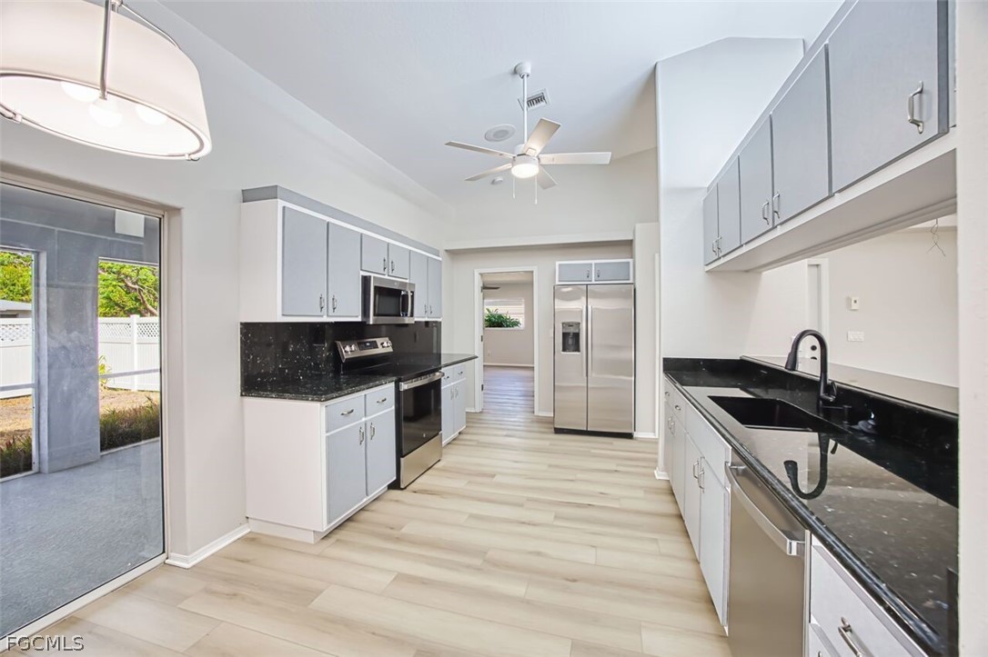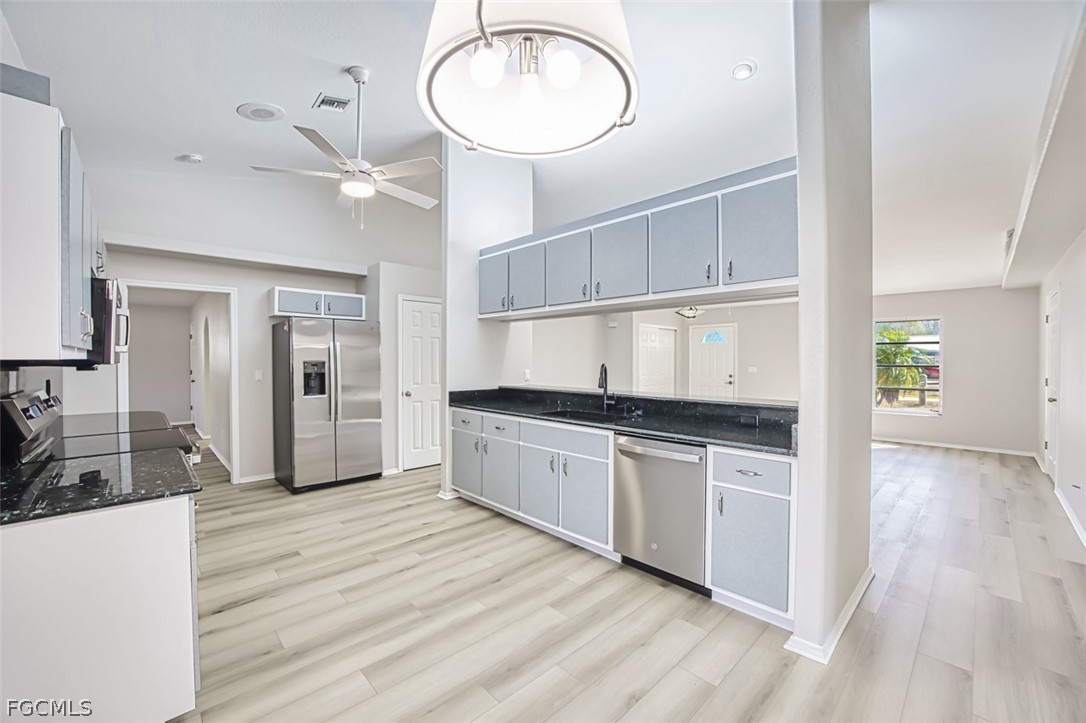 Recent improvements include new luxury vinyl plank (LVP) flooring throughout, a new GE appliance package, fresh interior paint, and a roof replacement in 2022. The kitchen features a new ceiling fan and chandelier, and the home also features a newer A/C system for added comfort.