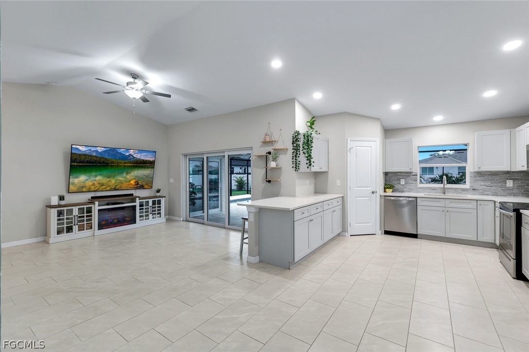 The screened-in SALTWATER pool & lanai (which was just built and completed June 2025) plus the added 6ft Vinyl fence (added by sellers after purchasing) create a private outdoor retreat, seamlessly connected to the main living area through large sliding glass doors. Vaulted ceilings and tile flooring throughout enhance the bright, modern feel.