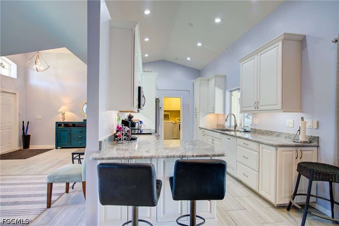 Additional features include a sprinkler system, lush mature landscaping, soaring vaulted ceilings, and beautifully maintained, vibrant grass. The home is being offered turnkey, with nearly everything included—garage cabinets, refrigerator, fireplace, and more all stay. A keypad entry adds convenience and security.